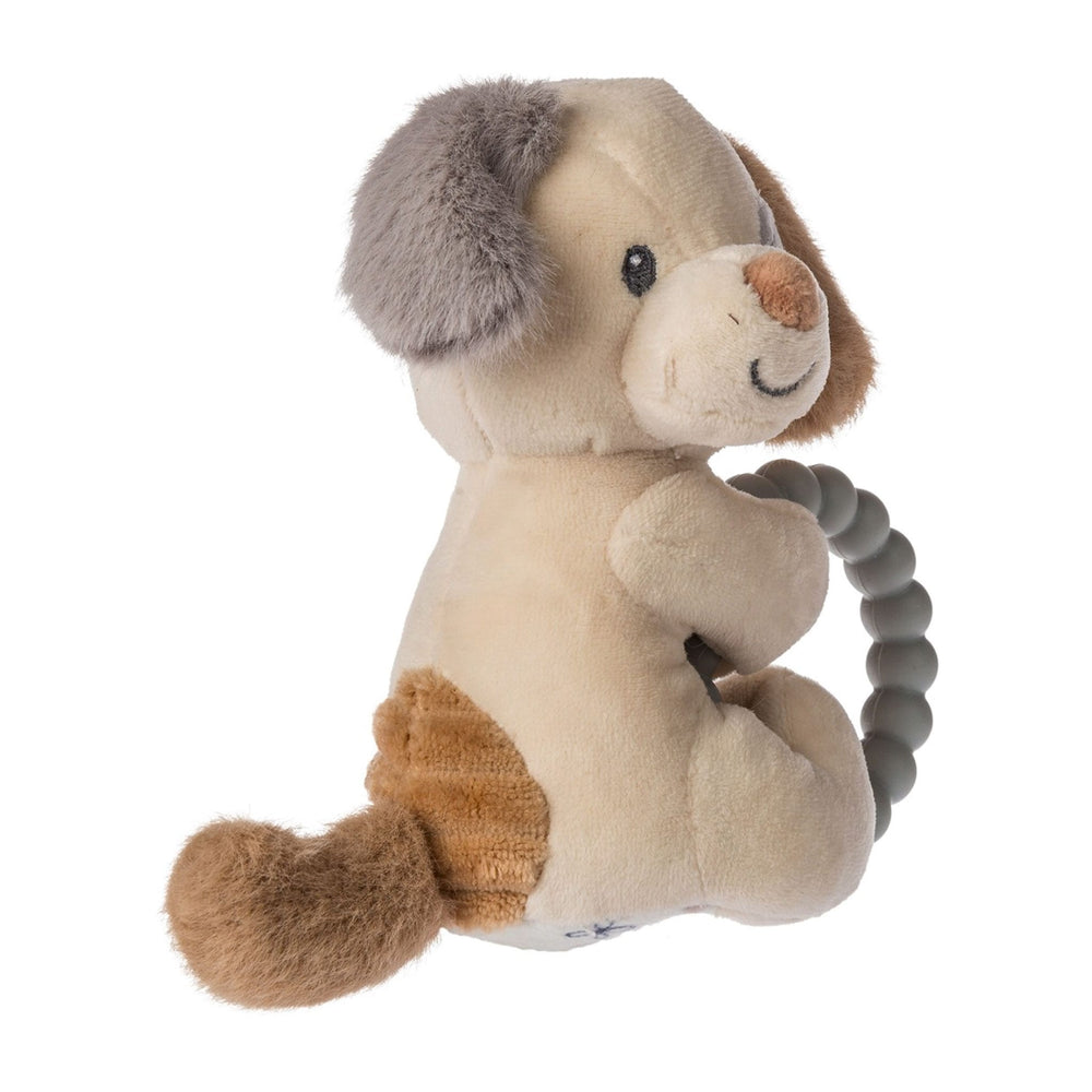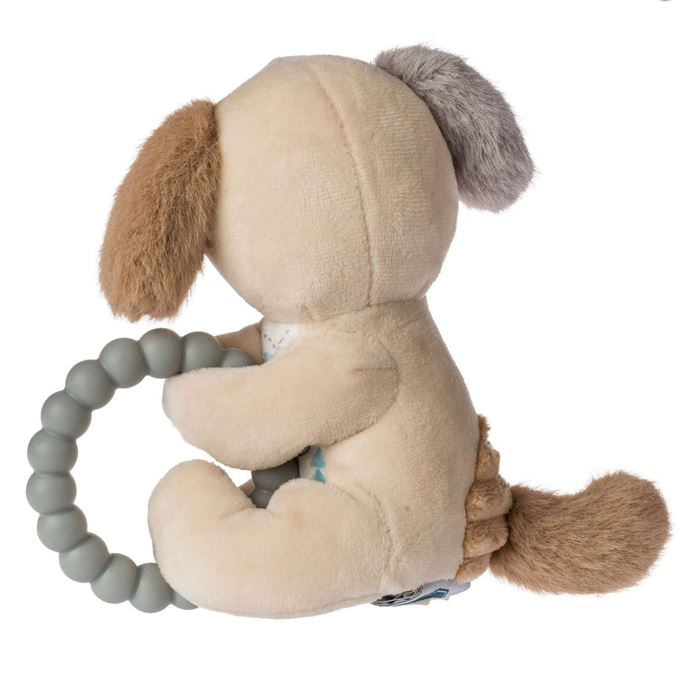 Un hochet à l'intérieur et un anneau de dentition en silicone à l'extérieur rendent ce chiot à la fois stimulant et apaisant.