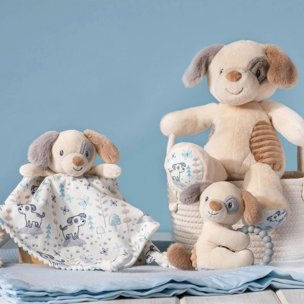Les chiots sont toujours un favori et un grand succès auprès des plus petits. Cet ami à quatre pattes dans des couleurs neutres, un tissu texturé doux et un grand sourire fera sûrement remuer la queue. La paire parfaite – chiot et bébé.