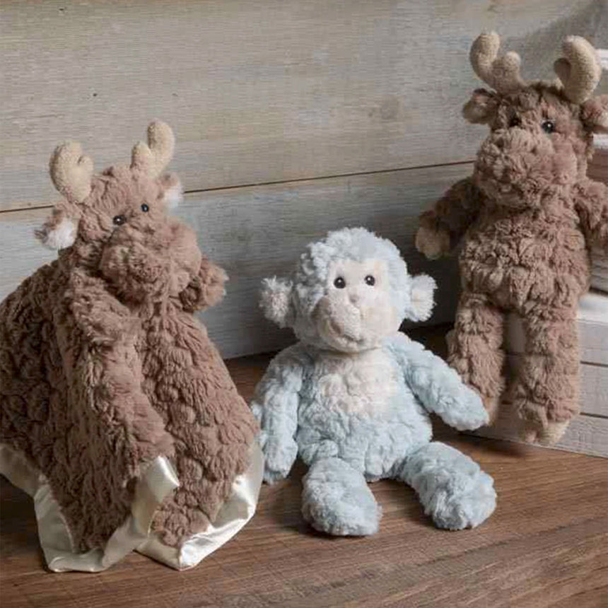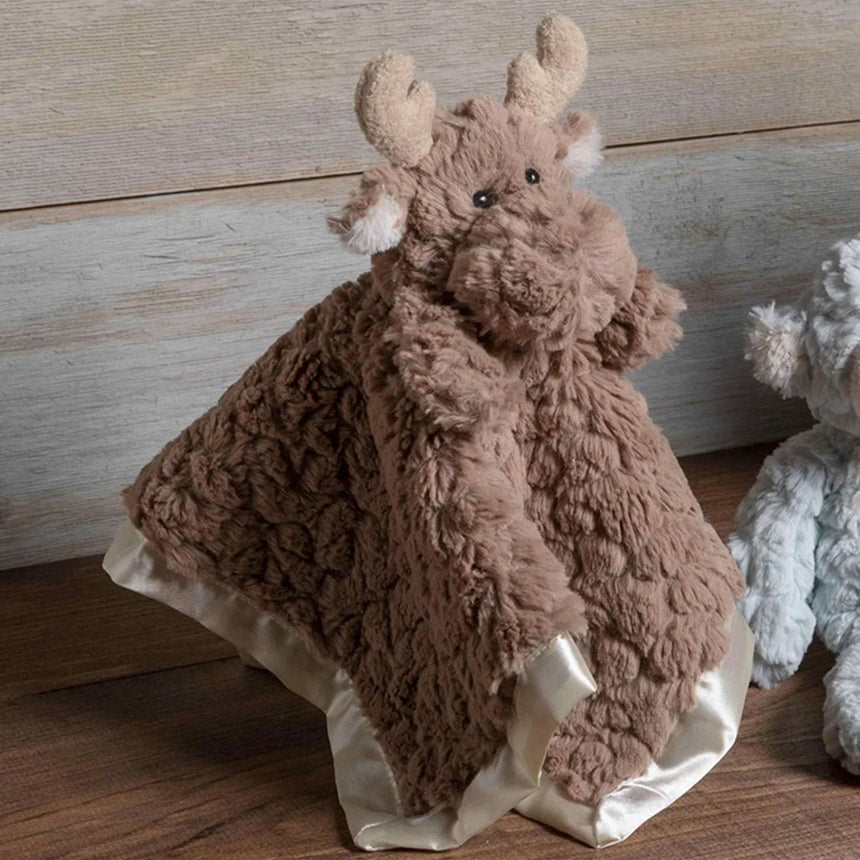 - Le personnage en peluche d'élan est assis au centre de la couverture