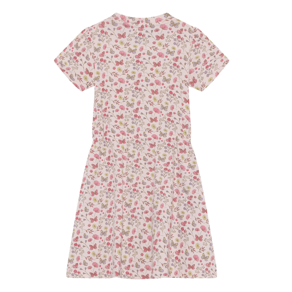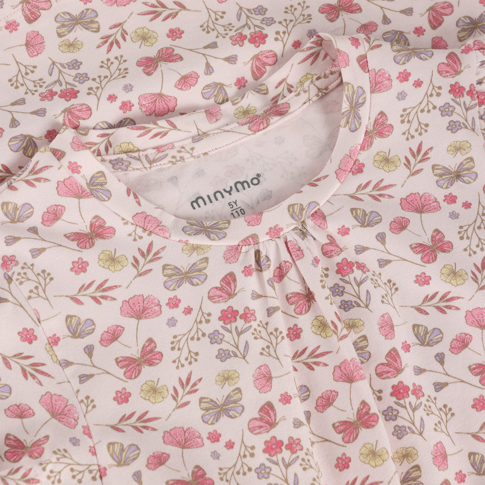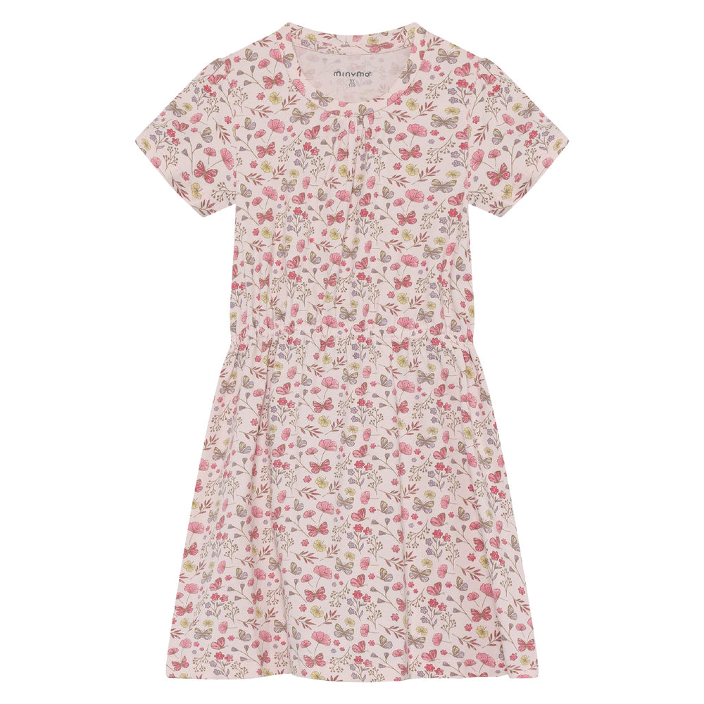Robe à manches courtes Minymo. Imprimé intégral. Manches légèrement bouffantes. Confectionnée dans un mélange de coton. Certifiée OEKO-TEX® STANDARD 100, n° 2276-364 DTI. Composition : 95 % coton / 5 % élasthanne.