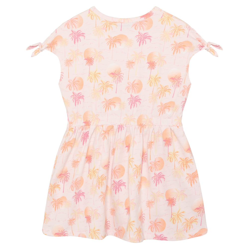 Robe à manches courtes Minymo. Imprimé intégral. Épaules à nouer et taille élastiquée. Confectionnée en coton biologique certifié. Certifiée GOTS - biologique CERES-0366. Composition : 95 % coton / 5 % élasthanne.