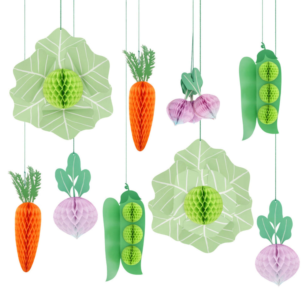 Célébrez le charme contemporain d’une décoration inspirée des légumes avec ce joyeux ensemble de décorations géantes en nid d’abeille. Plein de couleur et de caractère, il comprend trois carottes, deux betteraves, deux choux, deux cosses de petits pois et un bouquet de radis. Elles sont fabriquées en papier nid d’abeille et maintenues proprement grâce à des aimants dissimulés.