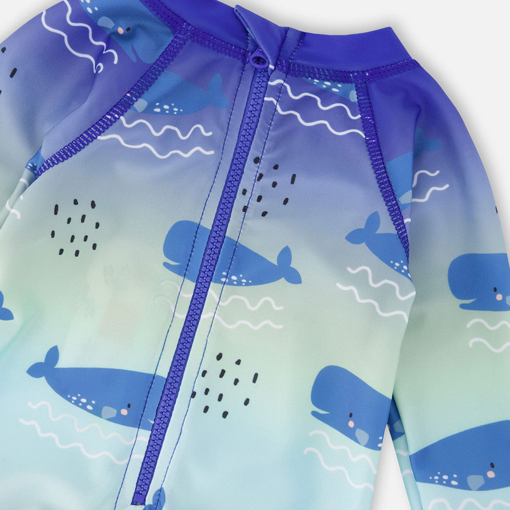 Notre rashguard à manches longues une-pièce bleu à imprimé baleines pour bébé et garçon apporte une touche ludique aux journées à la plage ou à la piscine. Ce maillot une-pièce à manches longues a un motif amusant de baleines dans les tons de bleu, confectionné en polyester recyclé extensible pour plus de confort et de liberté de mouvement. Sa fermeture éclair à l’avant facilite l’habillage tout en offrant une protection supplémentaire sous le soleil pour les garçons et les tout petits.