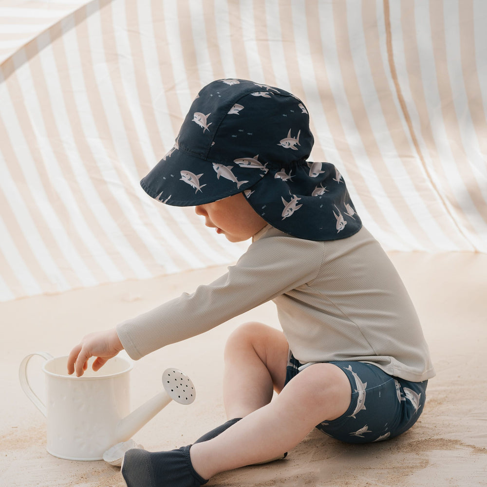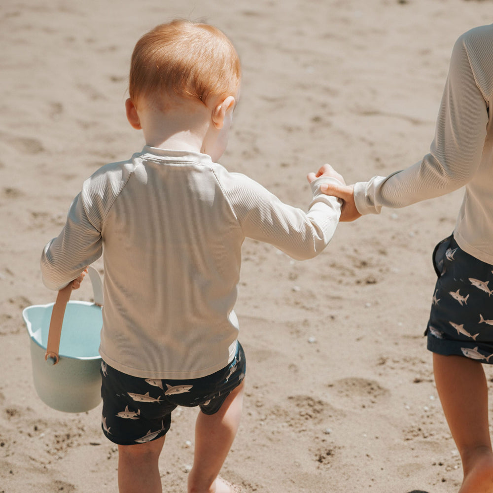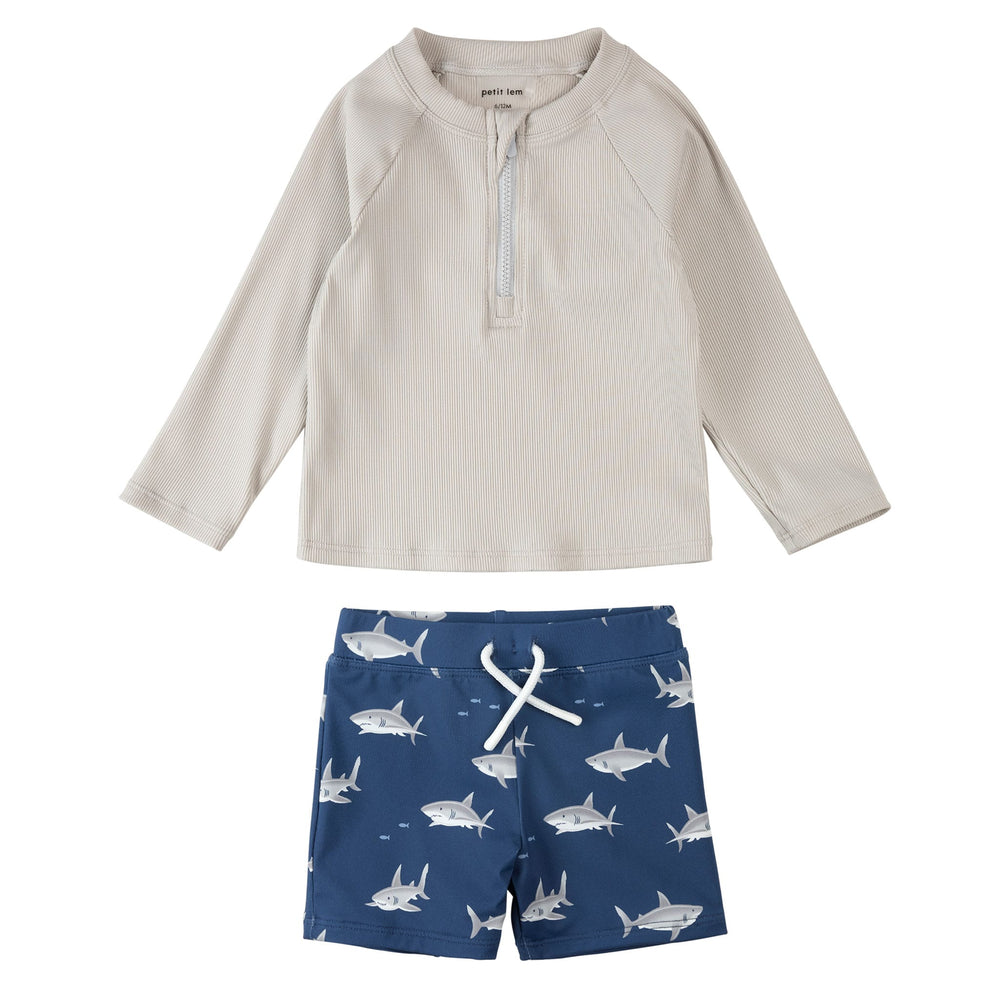 Parfait pour sa première visite à la mer, cet ensemble de bain deux pièces offre une protection complète contre l'eau fraîche et les rayons les plus rudes du soleil. Le haut à manches longues est conçu dans un tissu texturé à séchage rapide pour un confort qui dure toute la journée, avec une protection solaire UPF 50+ intégrée. Orné d'un imprimé de requins sur toute la surface, le short de bain fera sensation, tant à la plage qu'à la piscine.