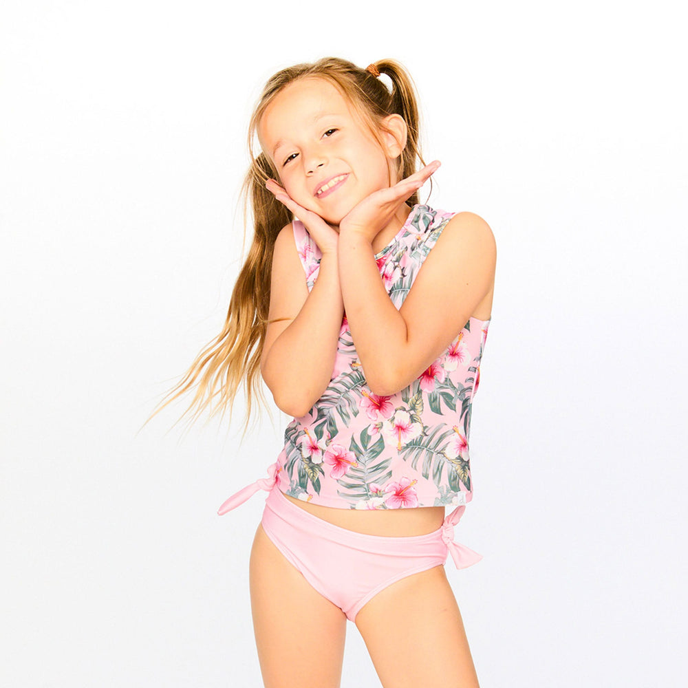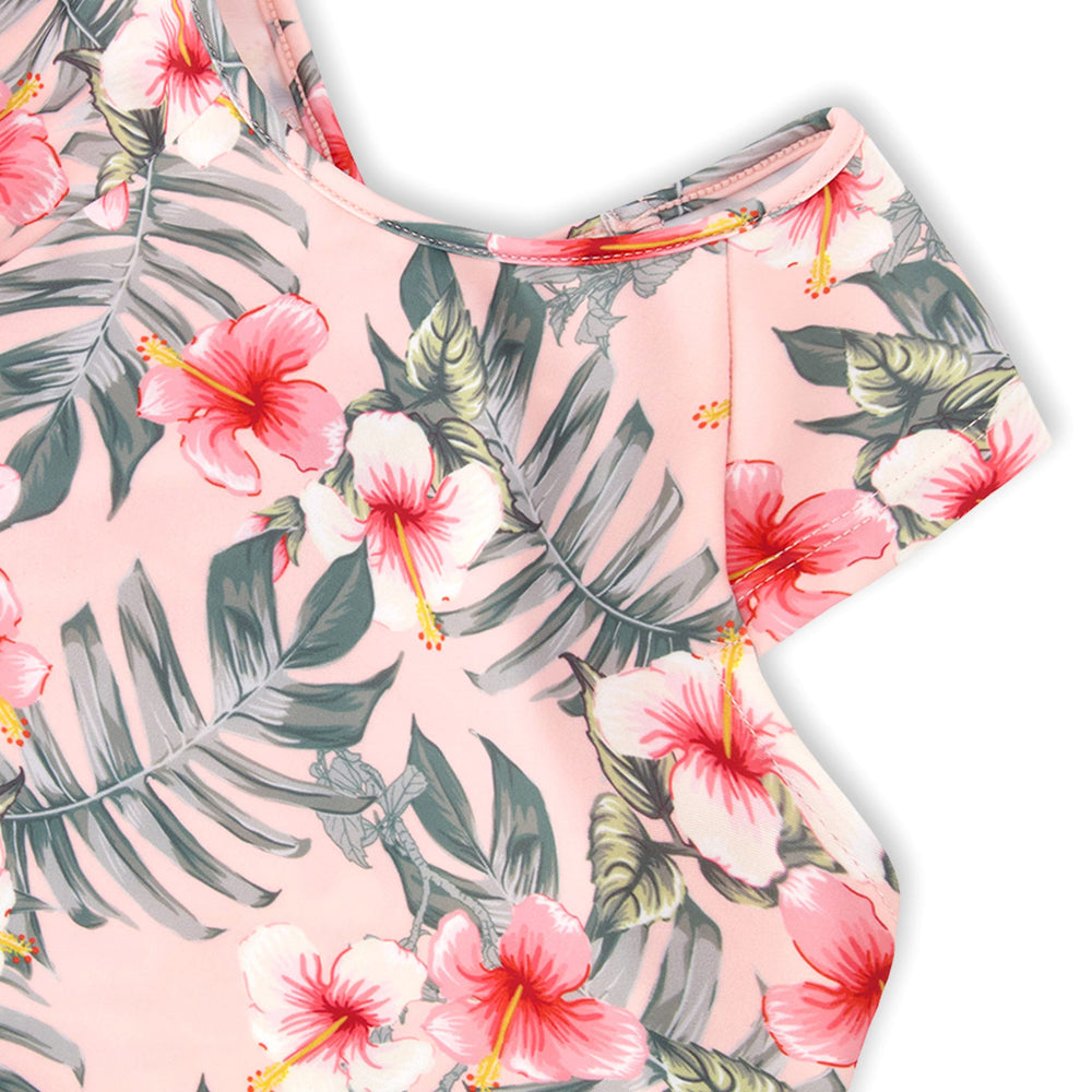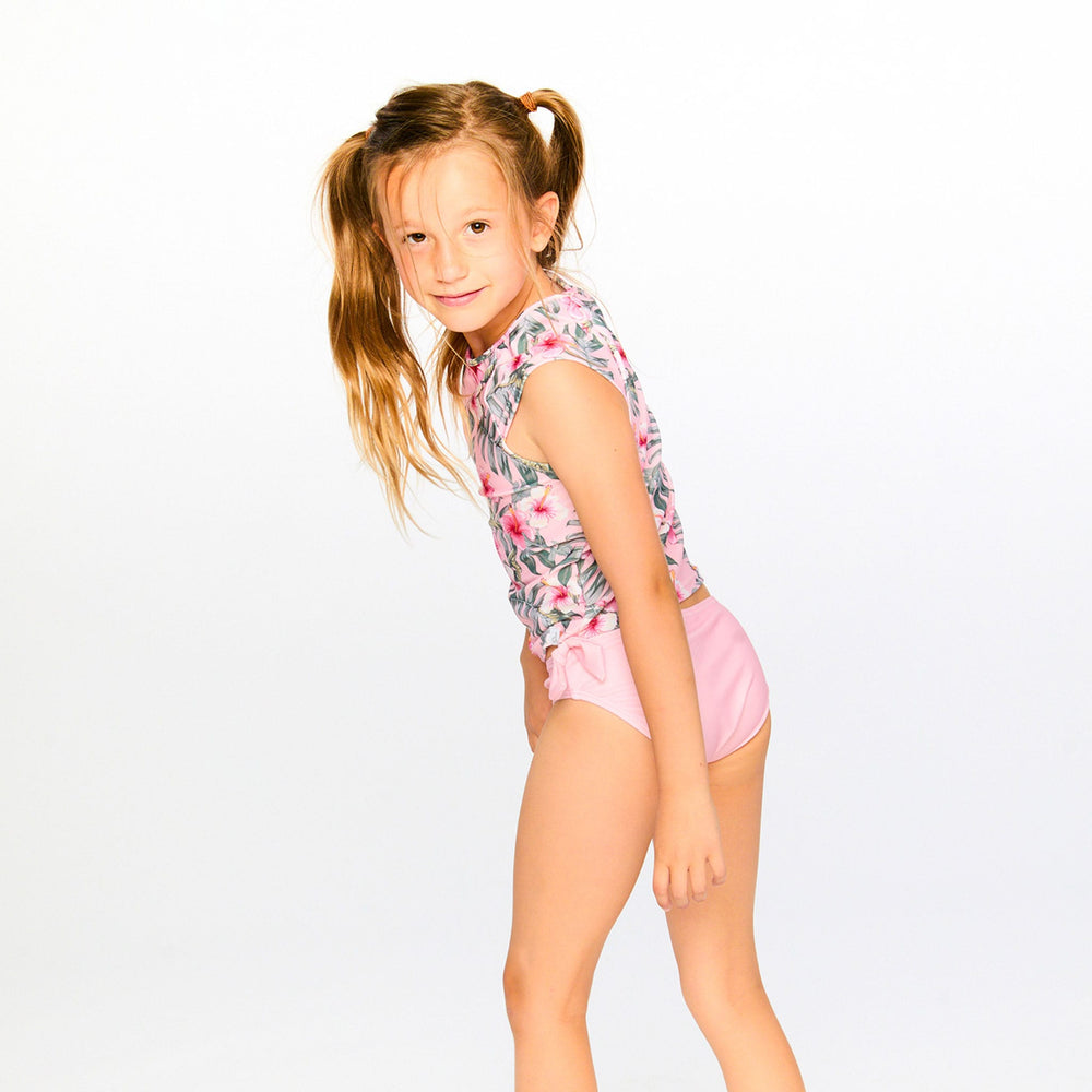 Frais et ludique, ce maillot de bain deux-pièces rose à imprimé hibiscus est conçu pour les journées ensoleillées. Cet ensemble de bain a un haut doté de petites manches et d’un col rond, avec un imprimé tropical d’hibiscus et de feuillages. La culotte assortie en rose uni est agrémentée de jolis liens à nouer sur les côtés pour un ajustement parfait.
