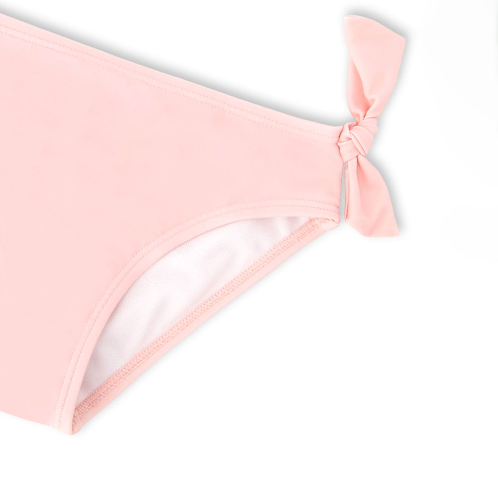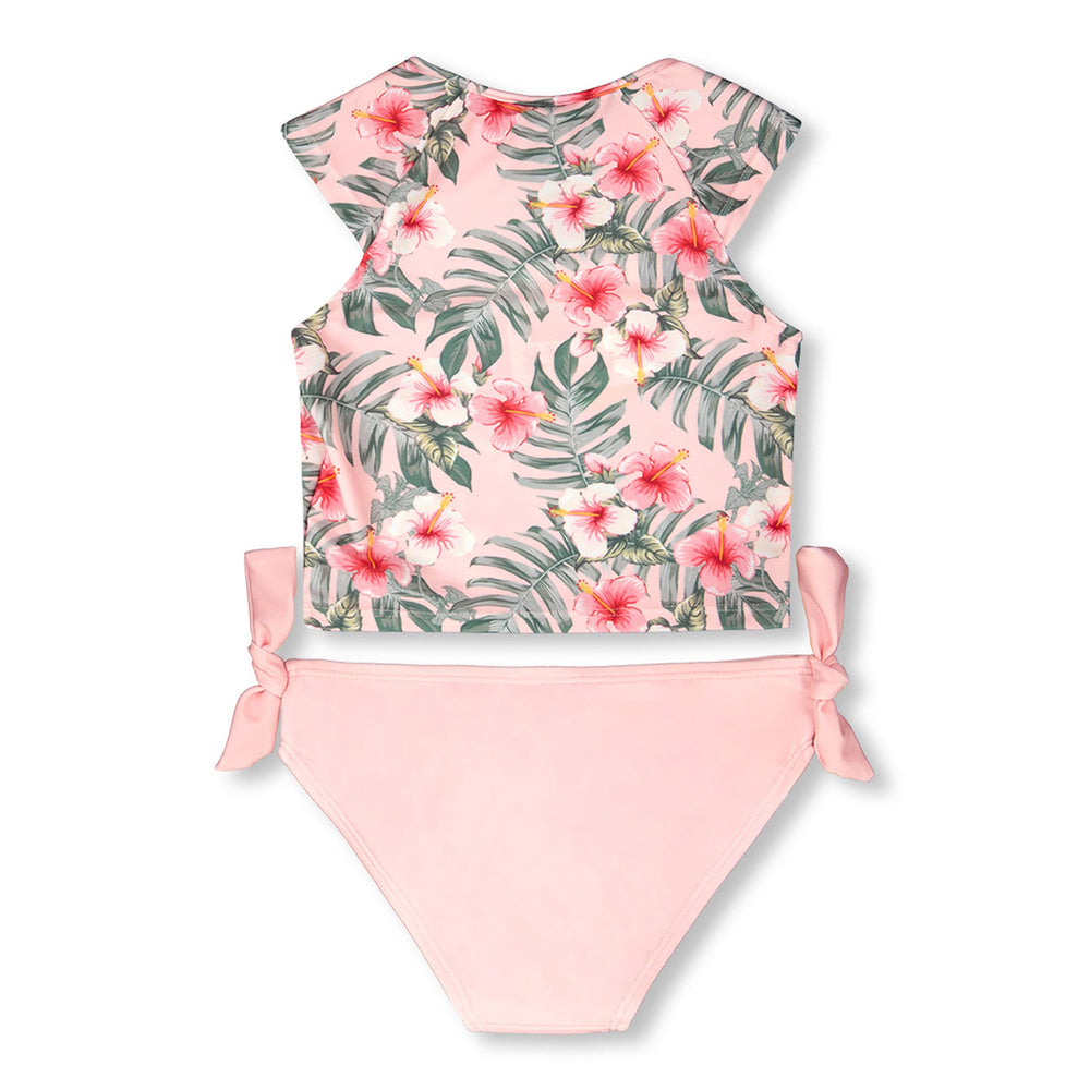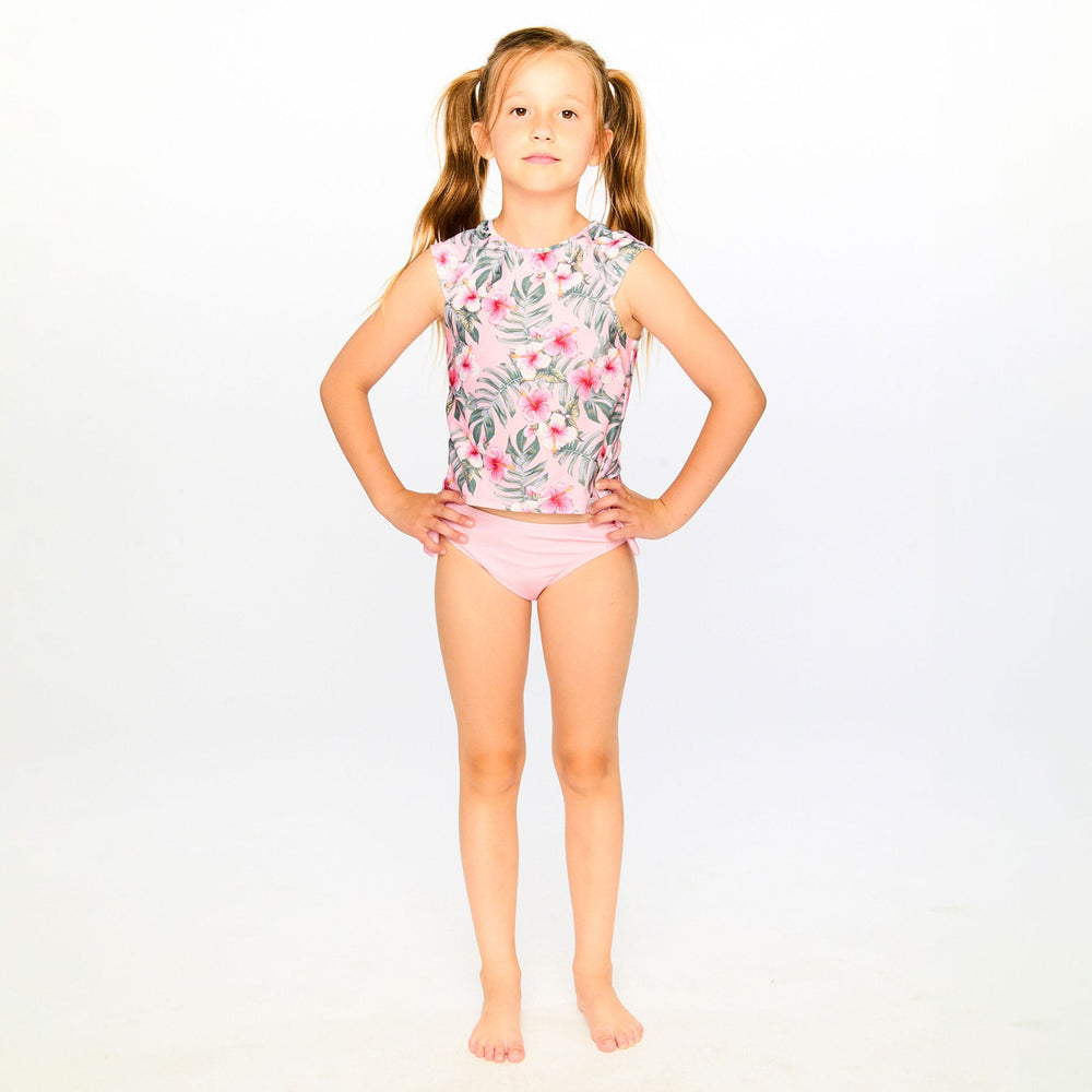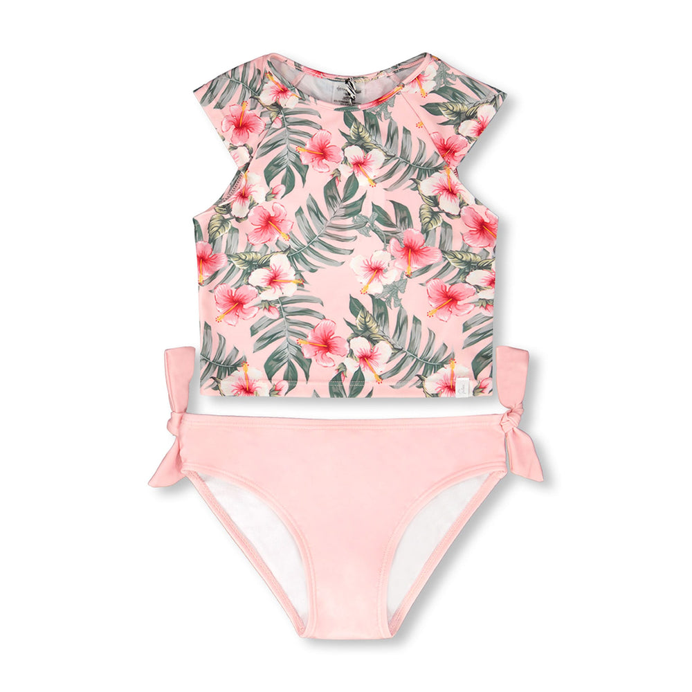 Frais et ludique, ce maillot de bain deux-pièces rose à imprimé hibiscus est conçu pour les journées ensoleillées. Cet ensemble de bain a un haut doté de petites manches et d’un col rond, avec un imprimé tropical d’hibiscus et de feuillages. La culotte assortie en rose uni est agrémentée de jolis liens à nouer sur les côtés pour un ajustement parfait.