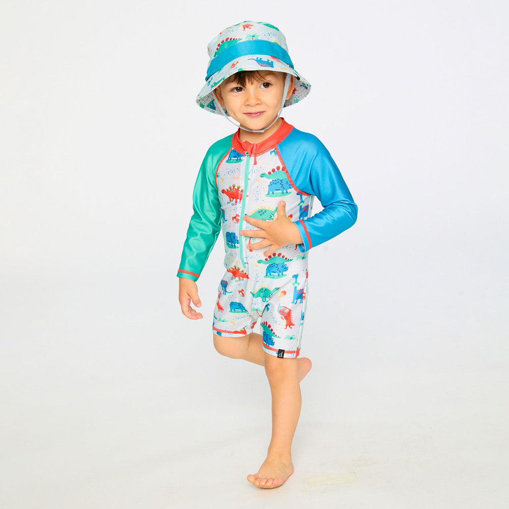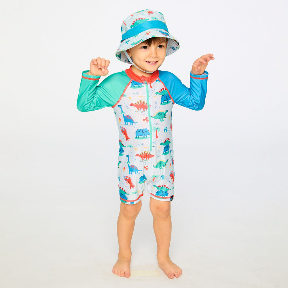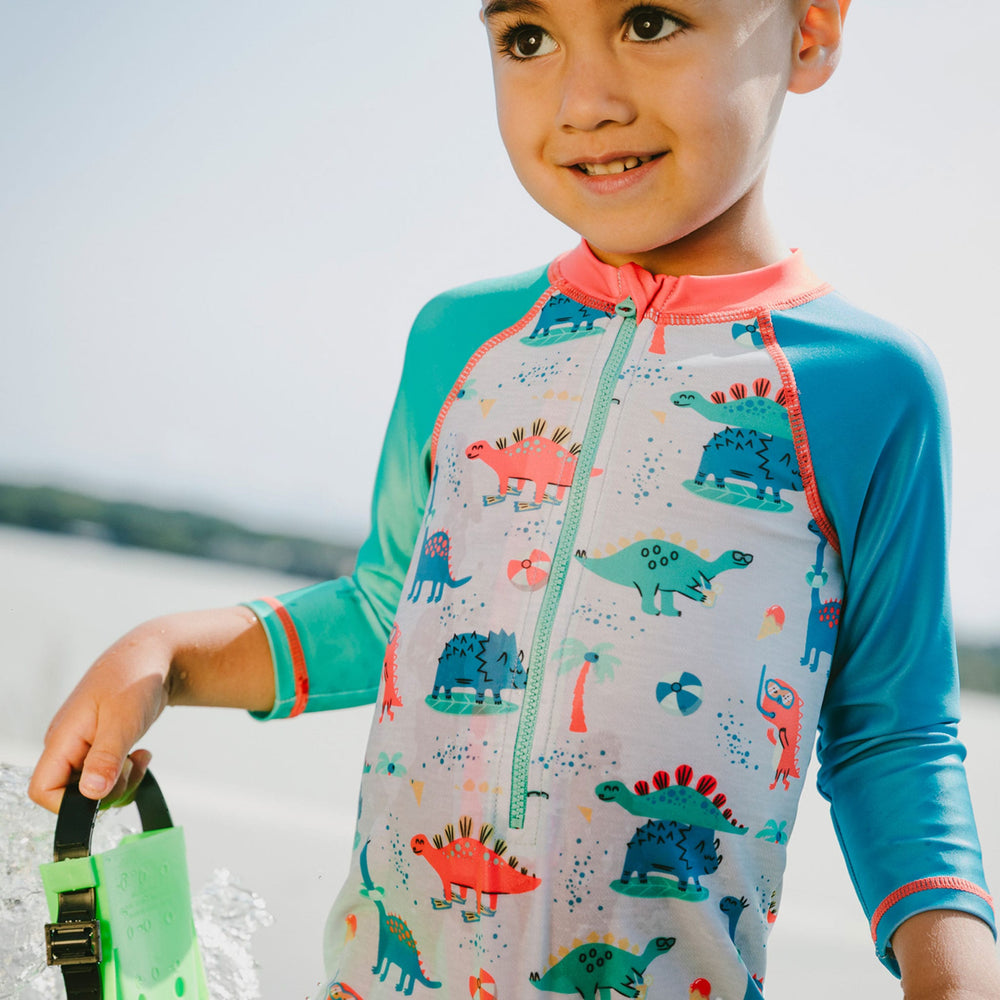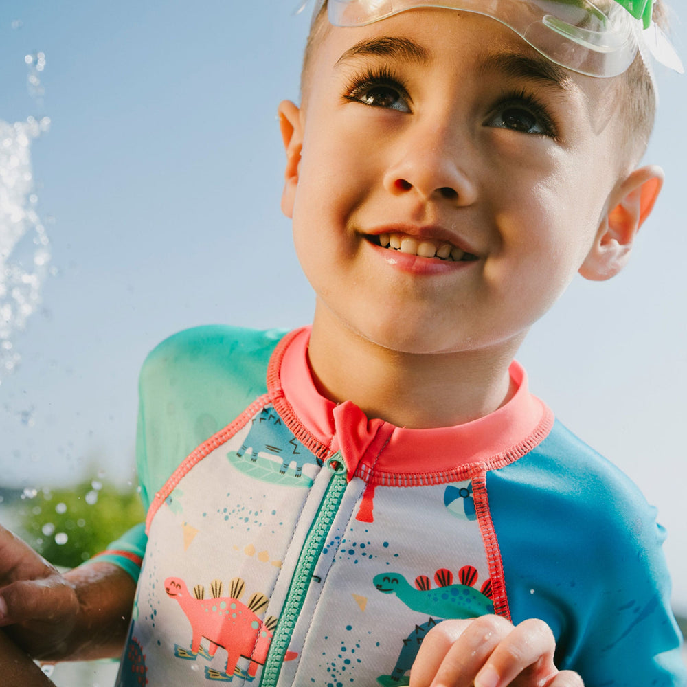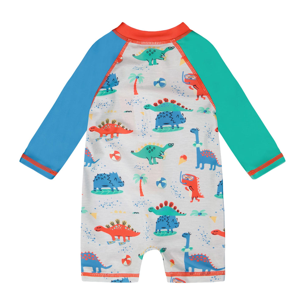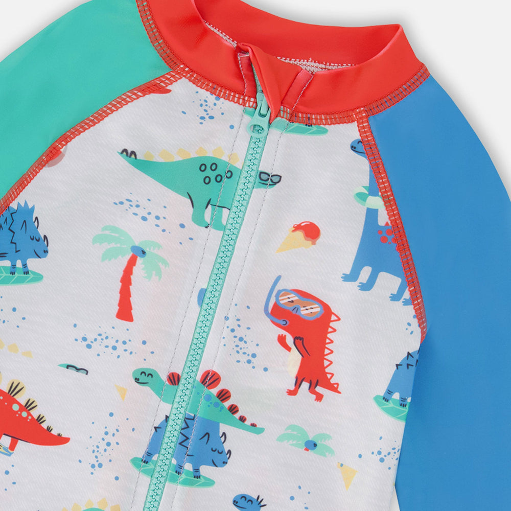 Le rashguard à manches longues une-pièce gris à imprimé bébés dinosaures pour bébé et garçon apporte une note ludique aux journées de baignade. Ce maillot une-pièce à manches longues est décoré d’un motif coloré de bébés dinosaures et de détails de plage, confectionné en polyester recyclé extensible pour un confort optimal et une grande liberté de mouvement. Sa fermeture éclair à l’avant facilite l’habillage tout en offrant une protection solaire efficace pour les garçons et les tout petits.