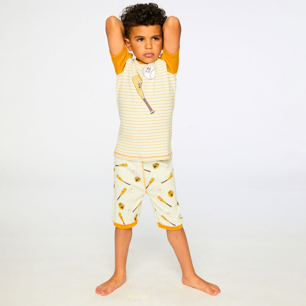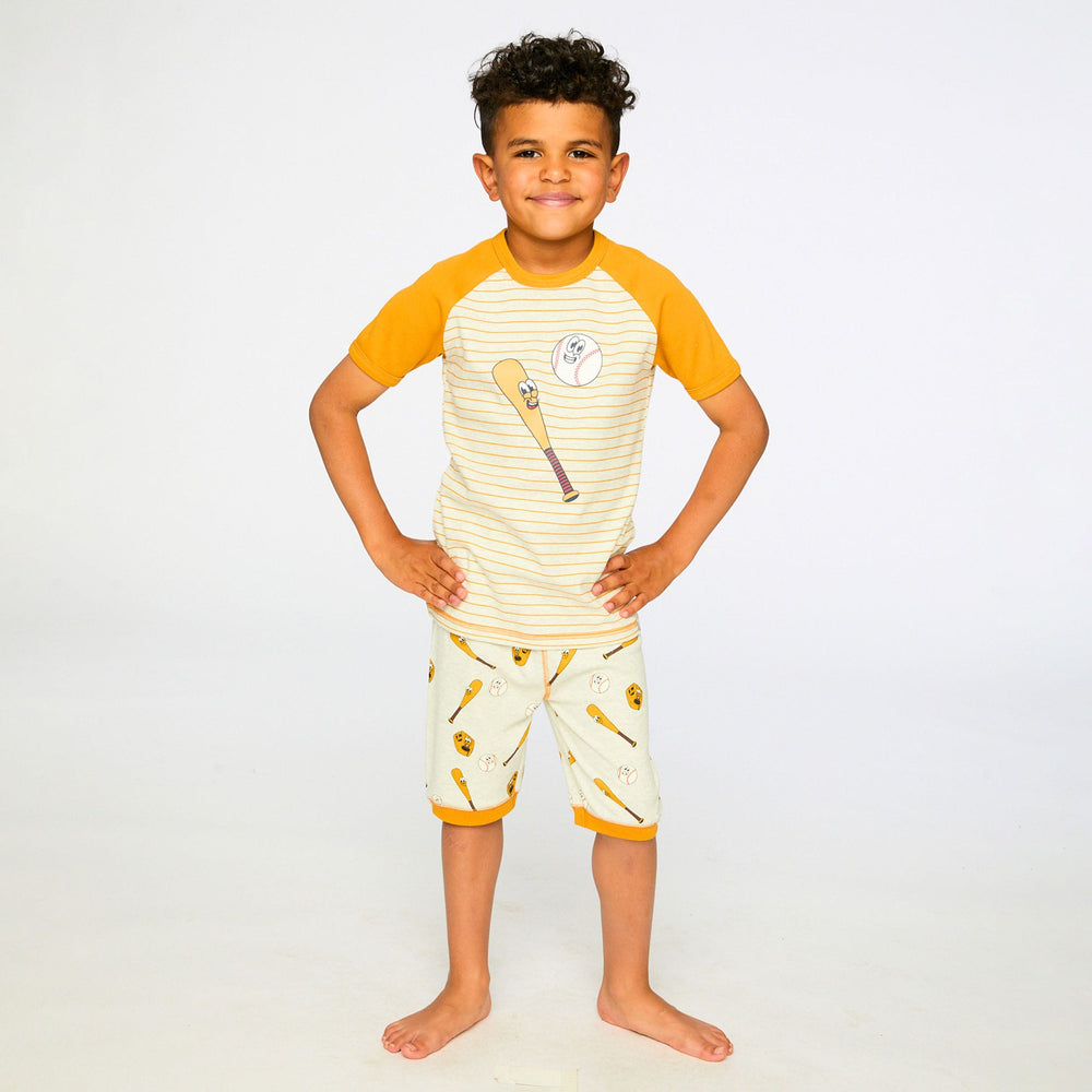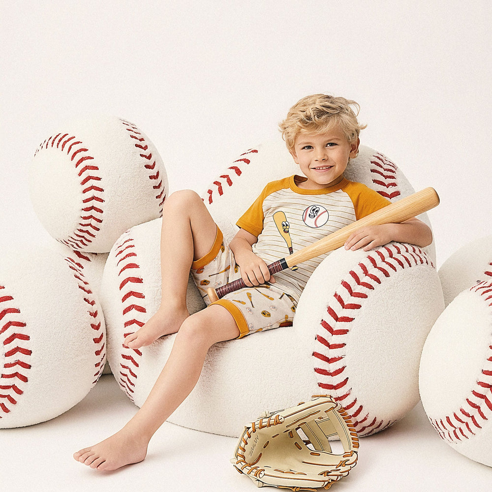 Les rêves deviennent un coup de circuit avec cet ensemble pyjama deux-pièces en coton biologique gris chiné à imprimé baseball issu de notre collection “Une nuit étoilée”. Cet ensemble a un t-shirt à manches courtes contrastantes et à rayures ludiques avec une batte et une balle amusantes, tandis que le short a un imprimé baseball intégral, une taille élastique pour plus de confort et des bordures contrastantes. Confectionné en 100 % coton biologique, cet ensemble est doux, respirant et parfait pour des nuits paisibles.