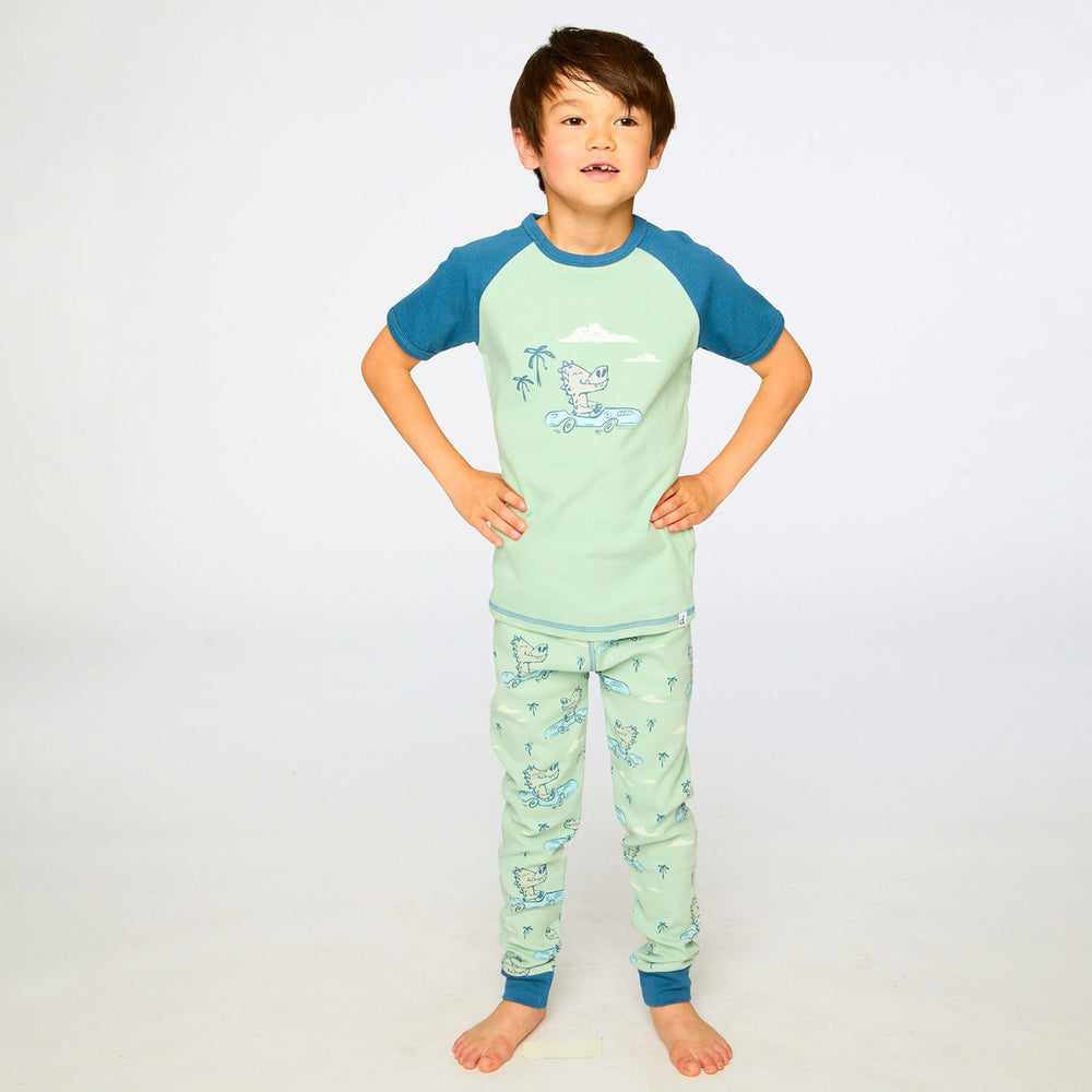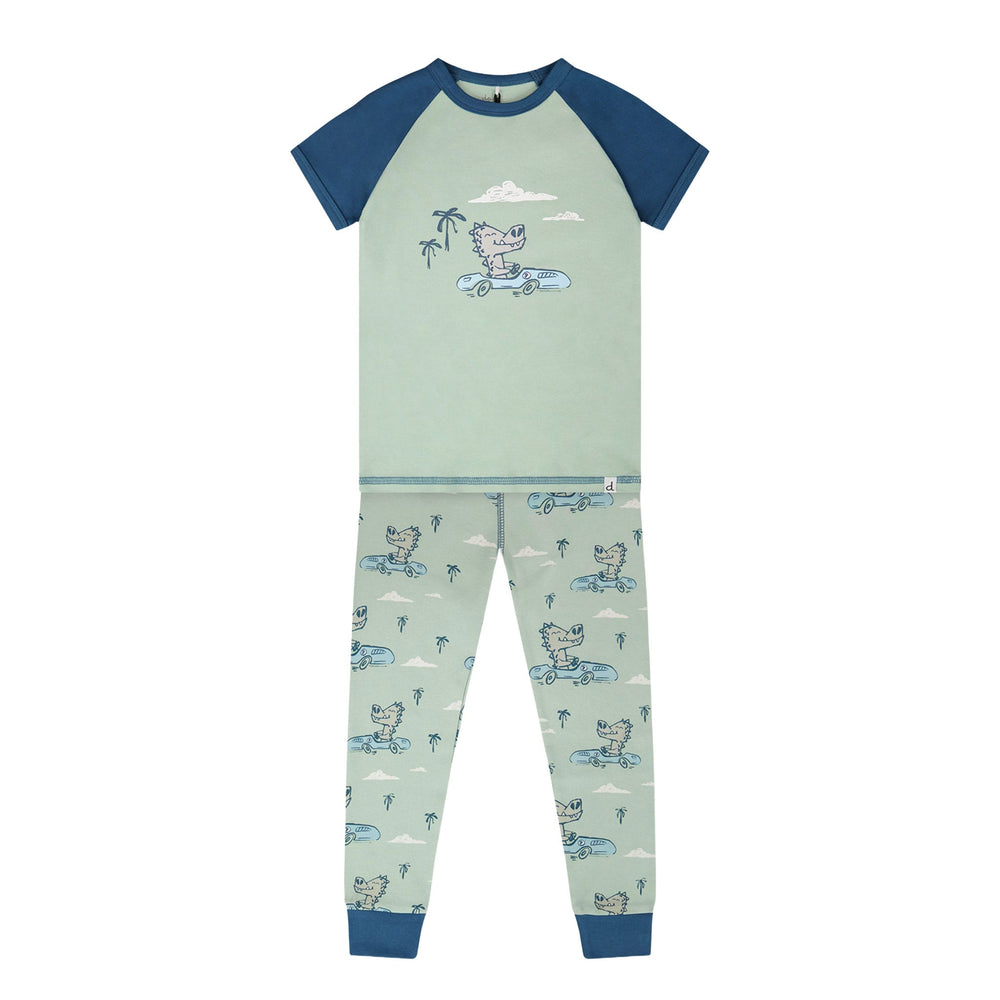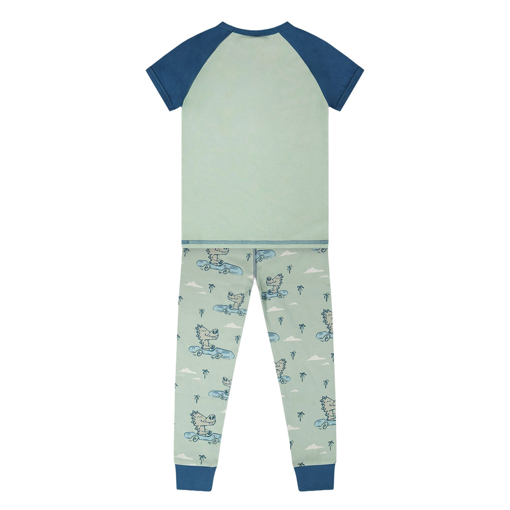 L’heure du coucher devient une aventure avec cet ensemble pyjama deux-pièces en coton biologique bleu à imprimé dinos. L'ensemble a un t-shirt à manches courtes raglan contrastantes avec un imprimé graphique de dino sur la poitrine qui s’accompagne d’un pantalon assorti orné d’un imprimé intégral de dinosaures, complété par des chevilles contrastantes ajustées pour plus de confort. Conçu en coton biologique doux, cet ensemble de la collection "Une nuit étoilée" est idéal pour les petits explorateurs.