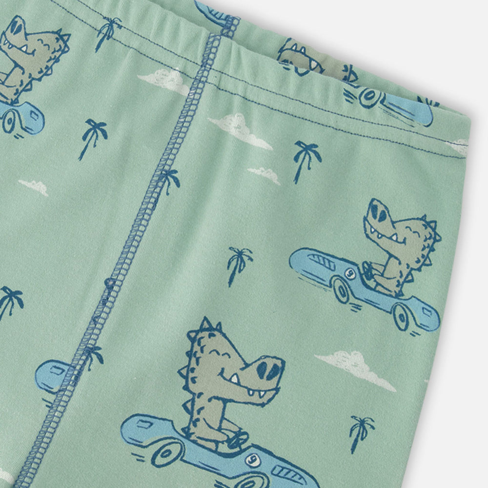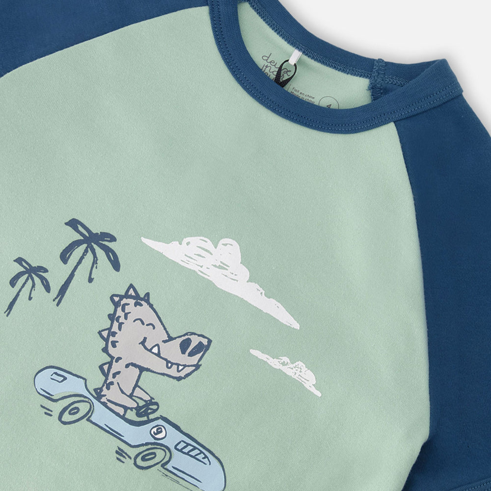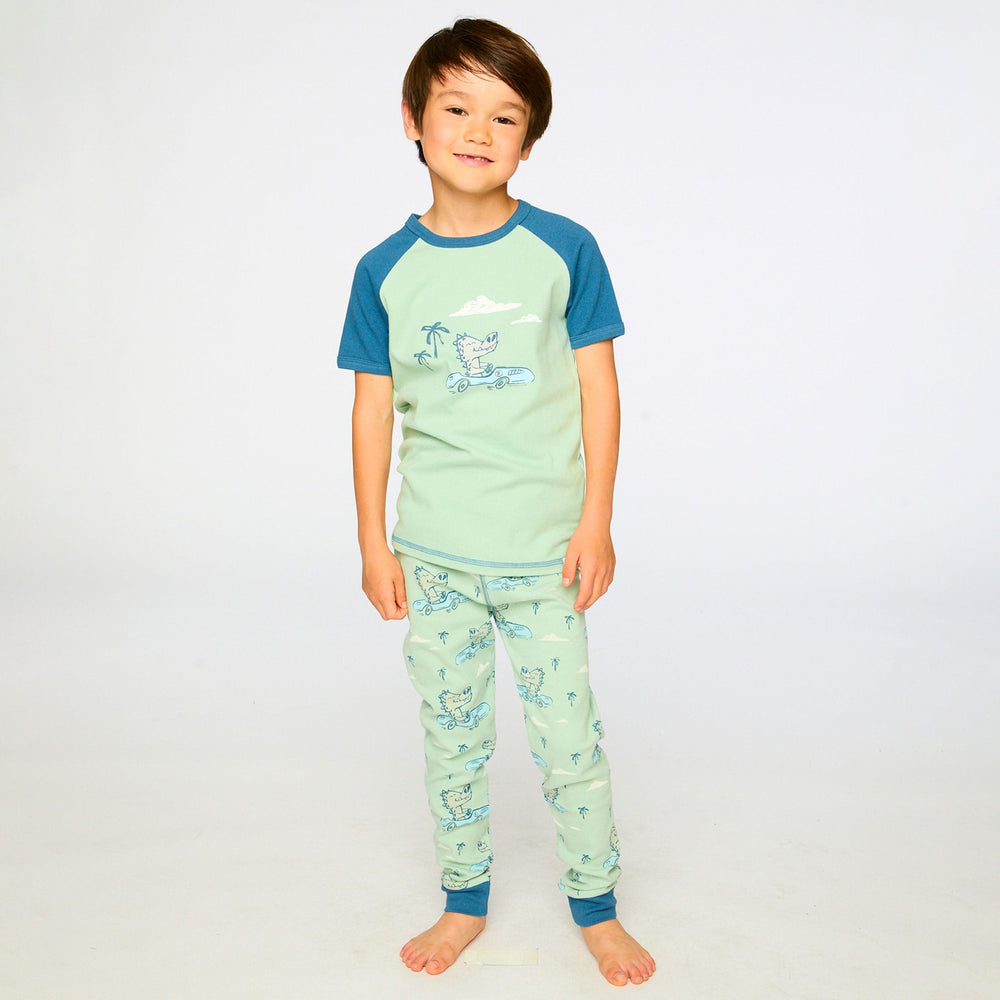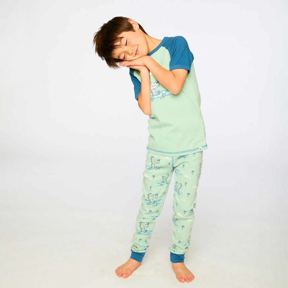 L’heure du coucher devient une aventure avec cet ensemble pyjama deux-pièces en coton biologique bleu à imprimé dinos. L'ensemble a un t-shirt à manches courtes raglan contrastantes avec un imprimé graphique de dino sur la poitrine qui s’accompagne d’un pantalon assorti orné d’un imprimé intégral de dinosaures, complété par des chevilles contrastantes ajustées pour plus de confort. Conçu en coton biologique doux, cet ensemble de la collection "Une nuit étoilée" est idéal pour les petits explorateurs.