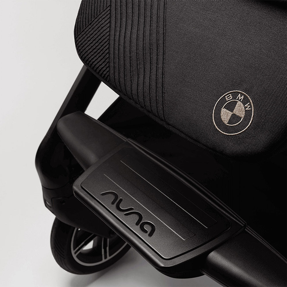 Logo BMW brodé sur le repose-jambes et le coussin réducteur pour nouveau-né.