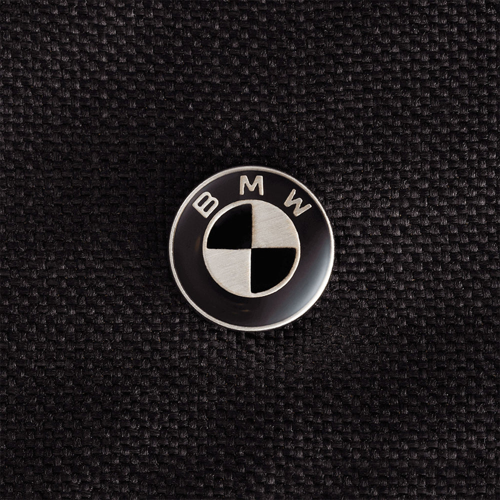 Motif BMW Trinity lustré sur le cadre noir mat. Insigne BMW sur le rabat de la capote.