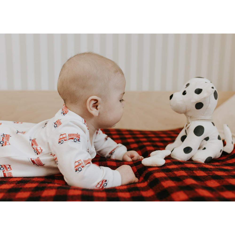 Conçue pour les petits héros en devenir et leurs compagnons à quatre pattes, cette grenouillère à pieds arbore un adorable imprimé pompier avec un dalmatien. Réalisée en coton biologique léger et respirant avec juste ce qu’il faut d’élasticité, elle garde les tout-petits bien au chaud pendant les sauvetages nocturnes comme lors des câlins du matin. La fermeture éclair bidirectionnelle facilite l’habillage et le change, tandis que les poignets côtelés et les pieds intégrés assurent un ajustement confortable.