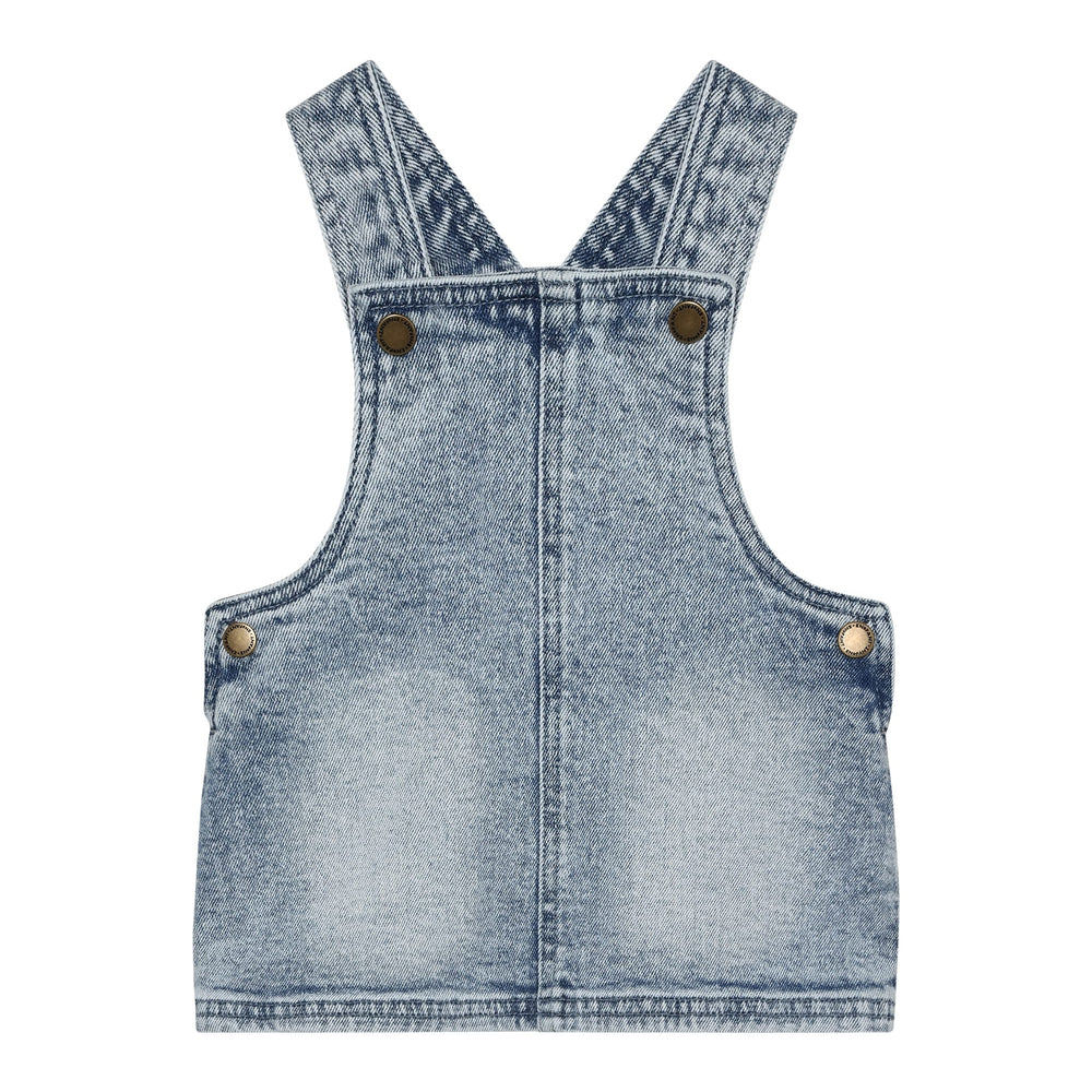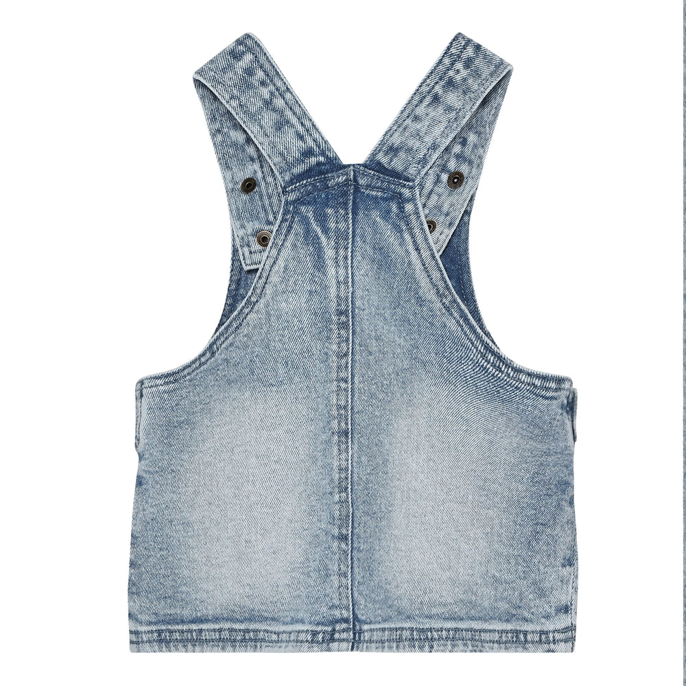 Robe en jean EN FANT à bretelles réglables. Cette robe s'ouvre à la taille et aux épaules. Certifiée OEKO-TEX® STANDARD 100, n° de certificat 2276-364 DTI. Composition : 95 % coton / 5 % élasthanne.