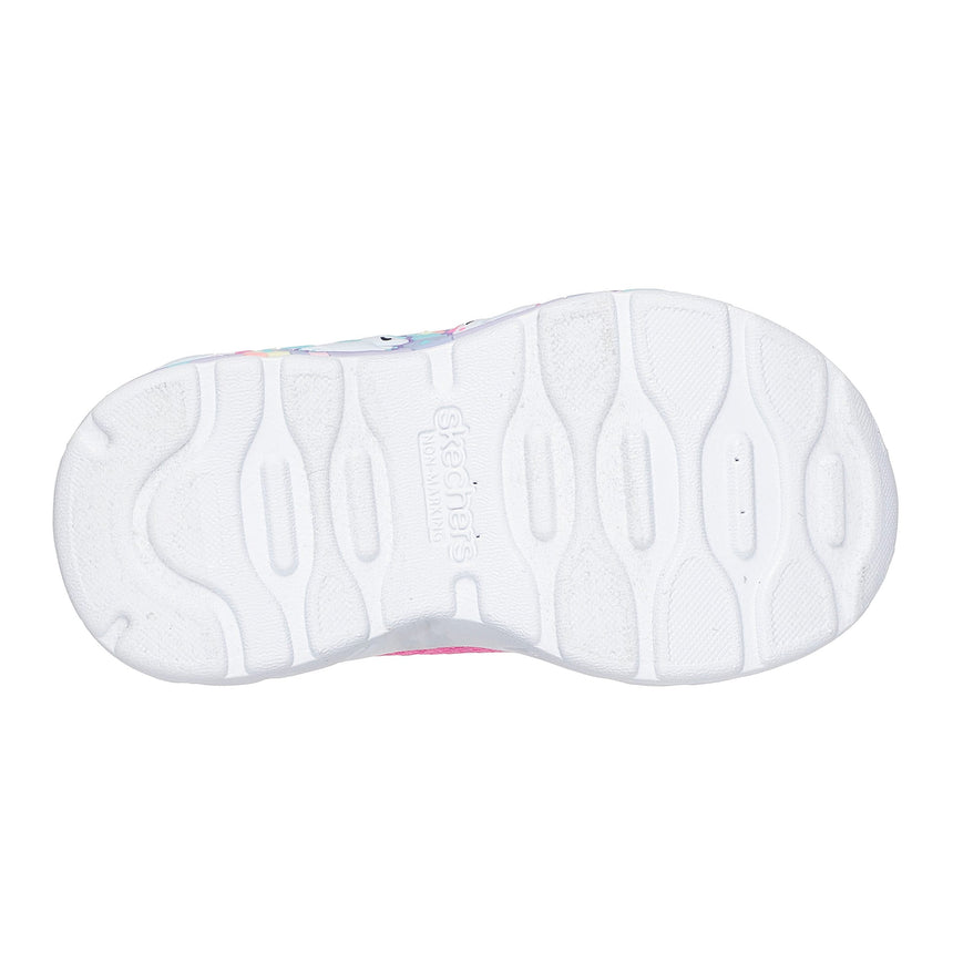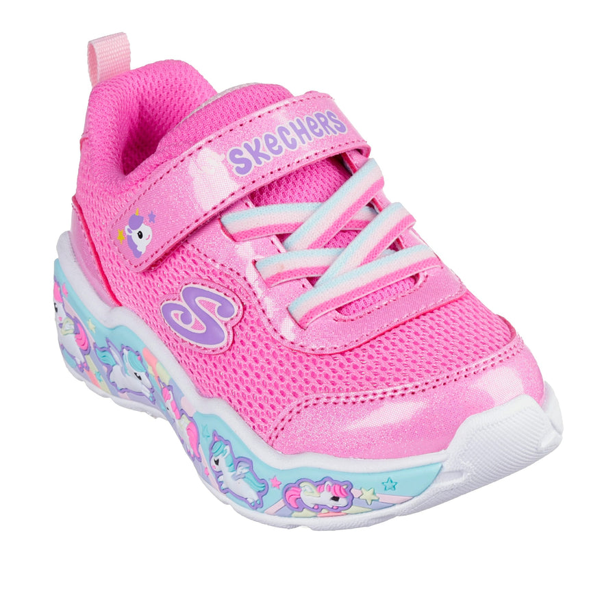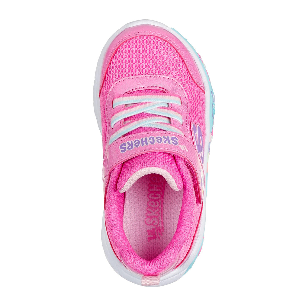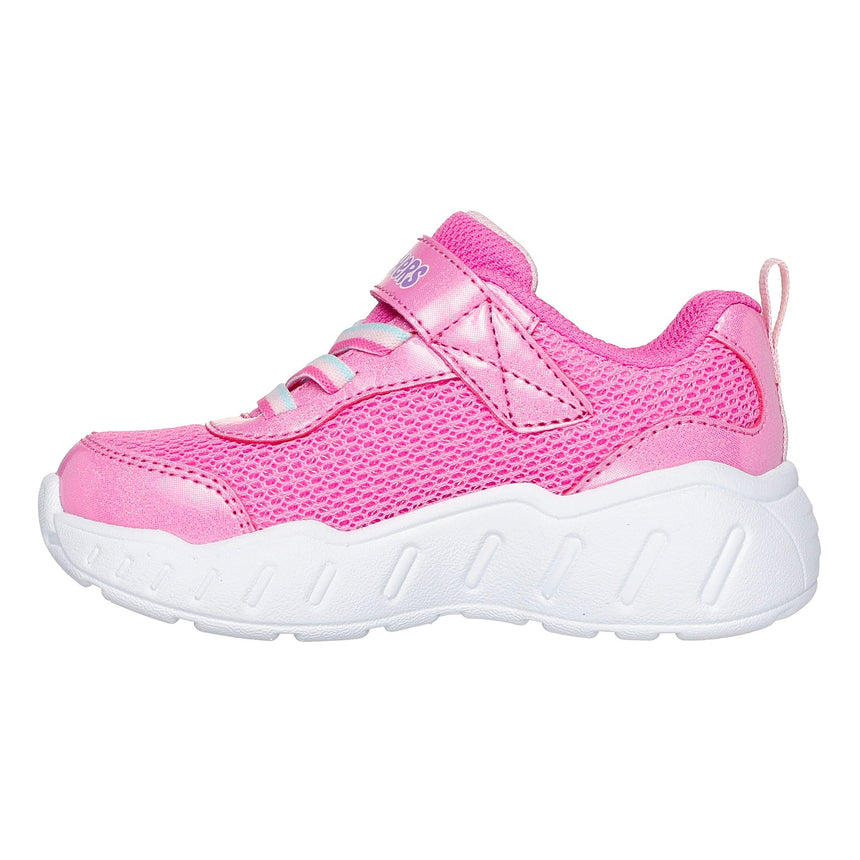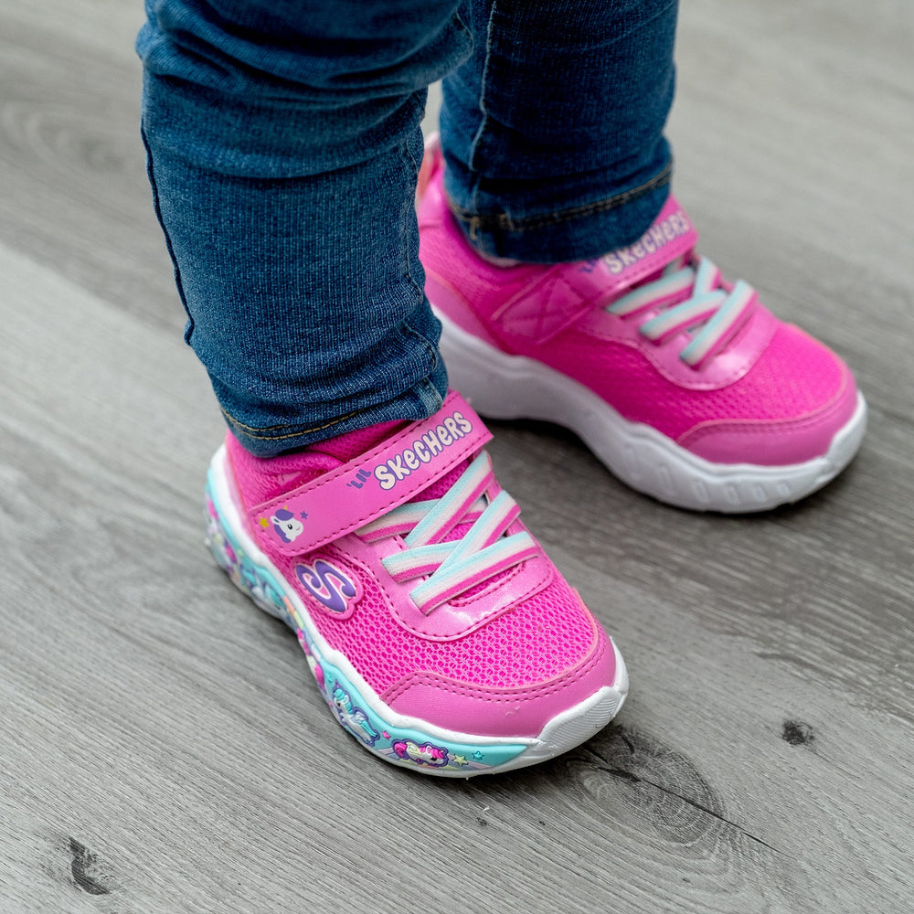 Votre tout-petit affichera son plus beau sourire en portant la chaussure Skechers. Cette chaussure de sport adorable comprend une empeigne en maille avec superpositions étincelantes, des lacets extensibles, une fermeture adaptative et une semelle intercalaire bien coussinée avec graphismes à thématiques amusantes.
