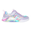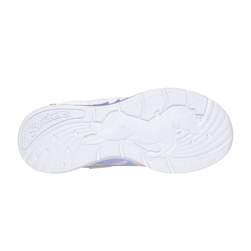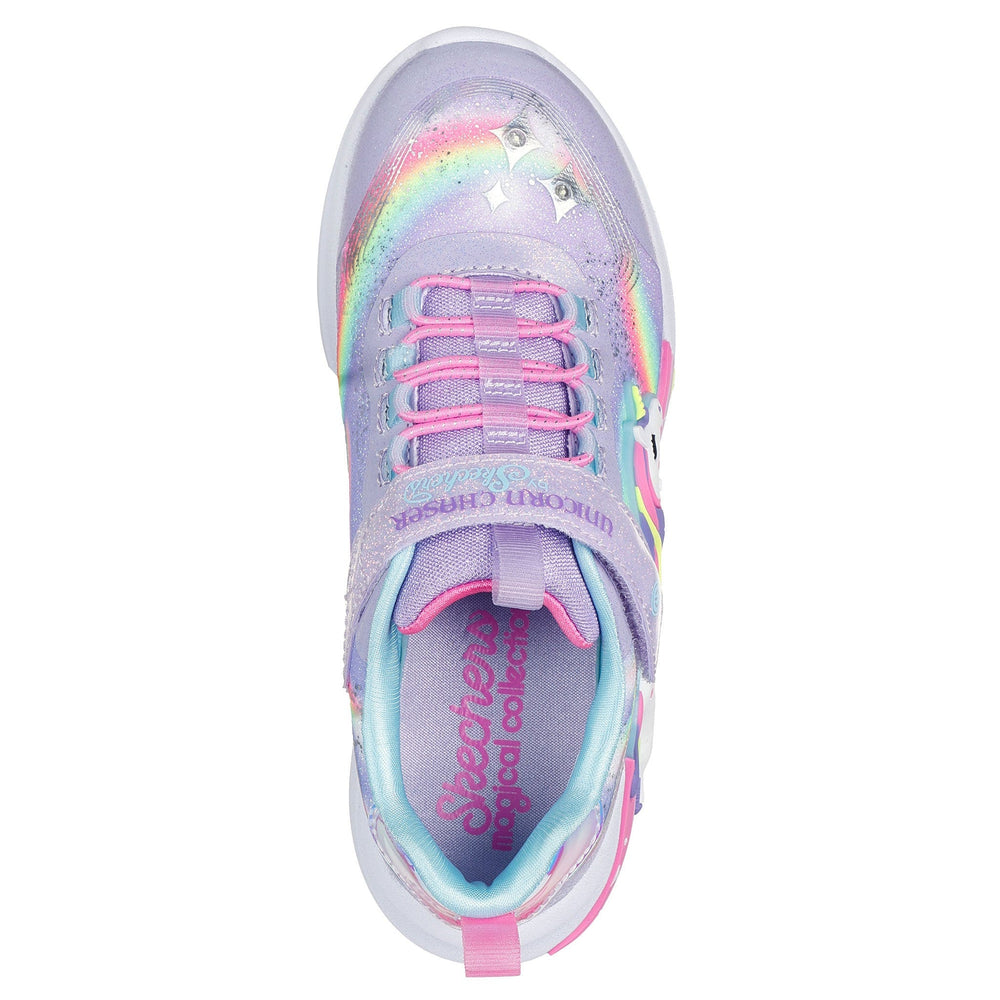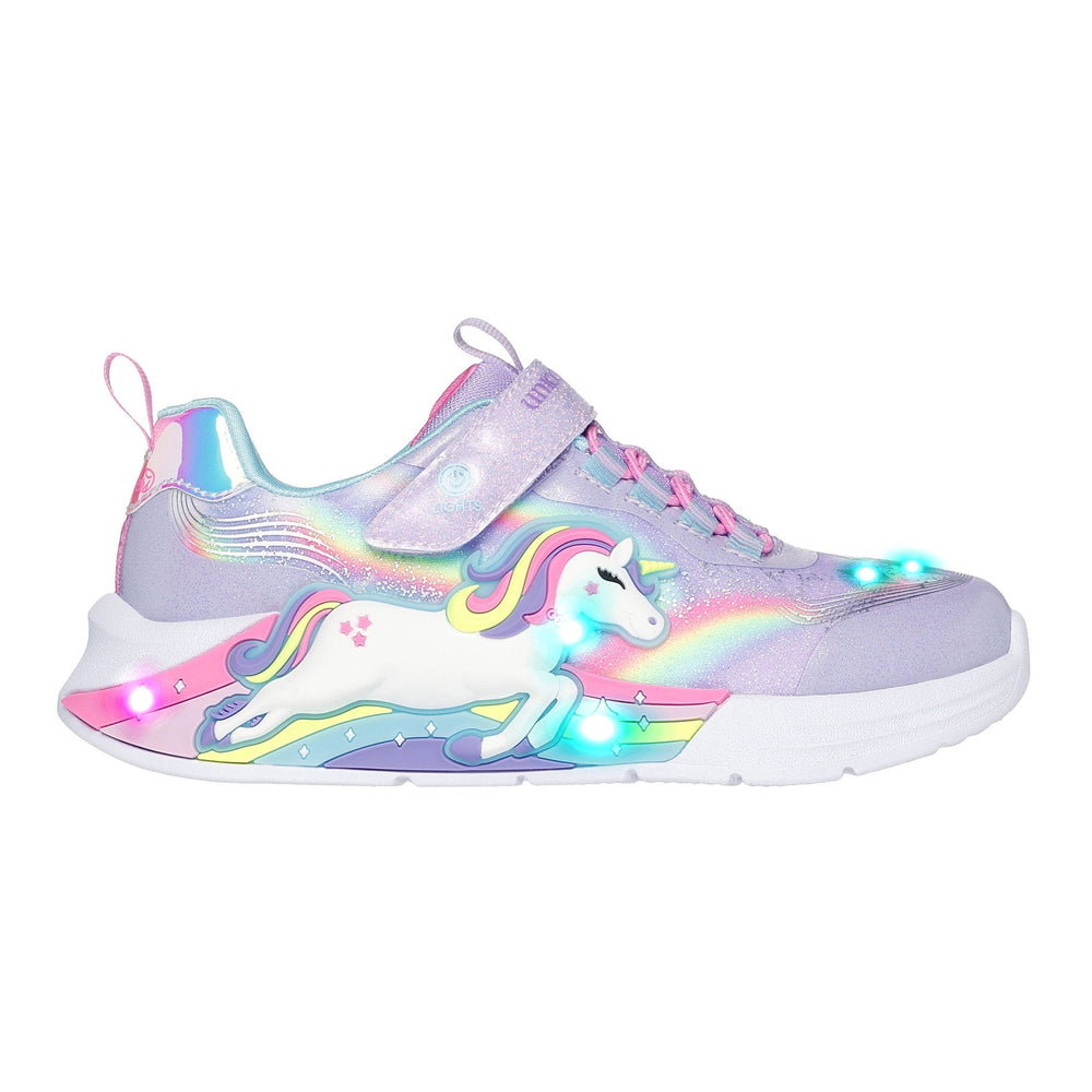Brillez de mille feux en portant les Skechers S-Lights® Unicorn Chaser. Ce modèle sportif de la collection lumineuse Magical Collection® présente un motif de licorne et d'arc-en-ciel sur le côté, des lacets extensibles, une sangle réglable sur le cou-de-pied, et une semelle intérieure rembourrée pour le confort.