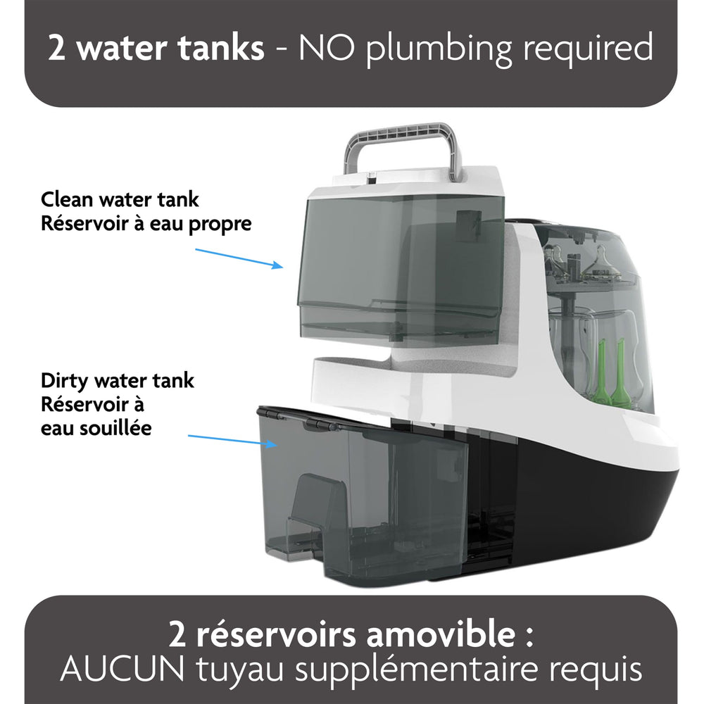 - Comprend des réservoirs amovibles pour l’eau propre et l’eau sale, pour une utilisation n’importe où dans la cuisine ou ailleurs dans la maison
