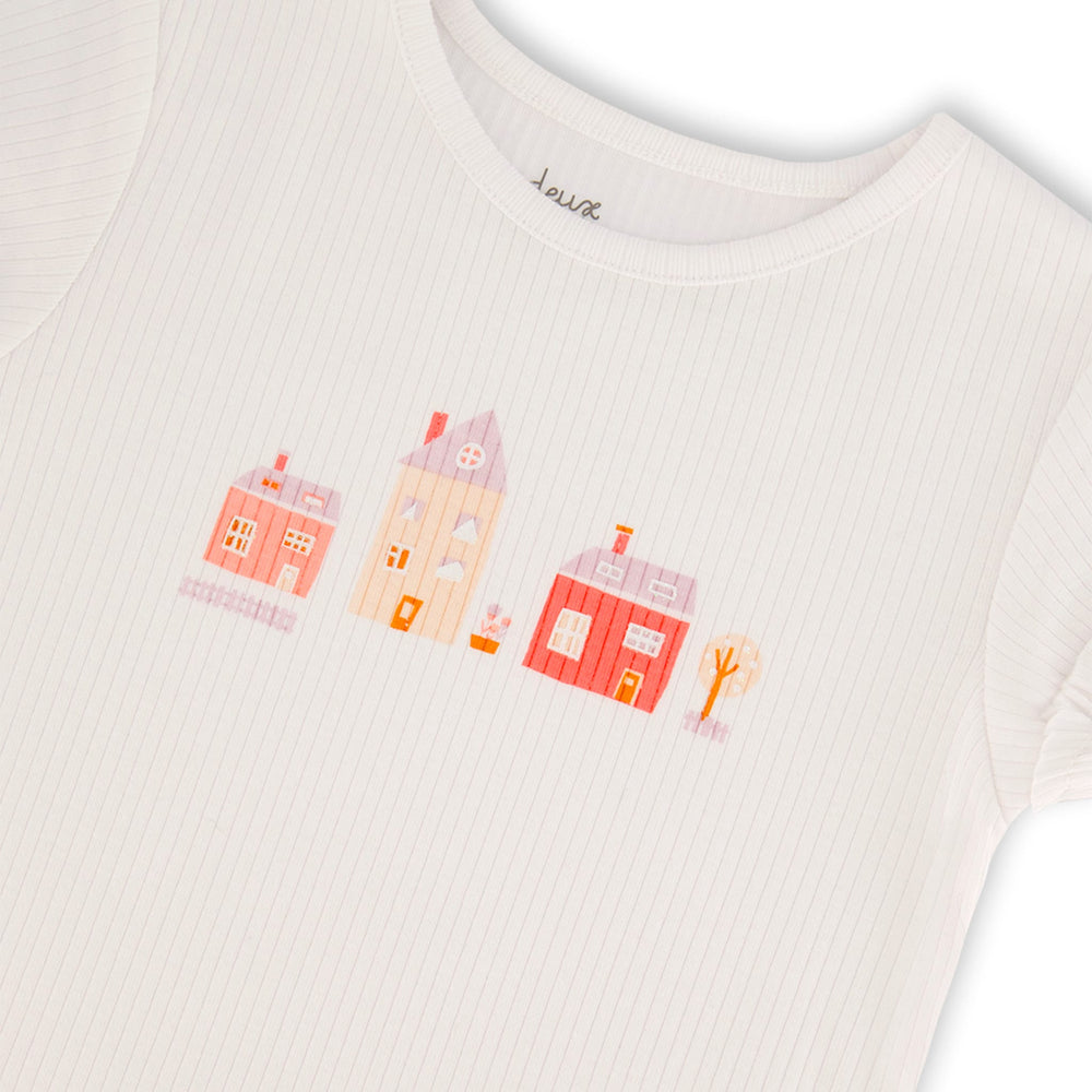 Ses côtes verticales ajoutent une texture subtile à notre T-shirt côtelé avec imprimé blanc avec maisons roses. Très doux et agréable à porter, ce t-shirt polyvalent a une silhouette à manches courtes en coton extensible avec un col rond, des manches élastiques froncées et un imprimé de maisons sur la poitrine. Il s'associe parfaitement avec n'importe quel bas de notre collection "La maison du bonheur" !