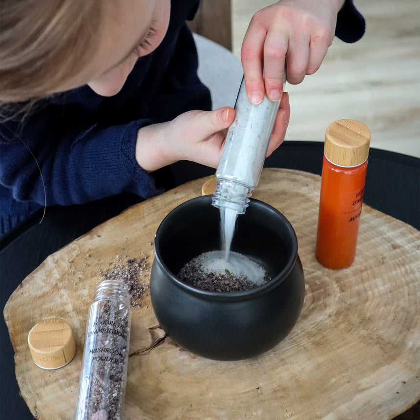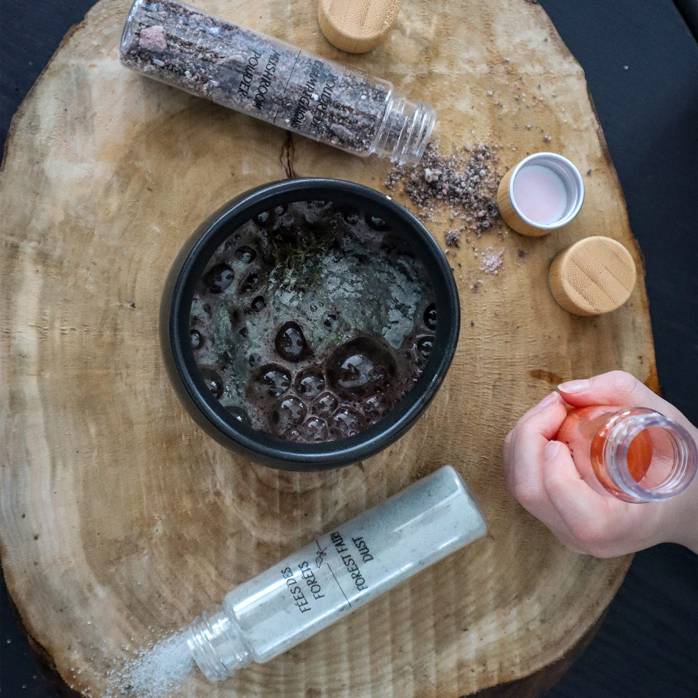 With soothing forest ingredients, this mini magic potion play kit will help your child feel safe and find the courage to face any adventure. Each ingredient in this set is unique and will allow your young wizard to create a talisman of protection. Activate the power of bubbles for a magical experience with this single-use pocket-sized kit!
