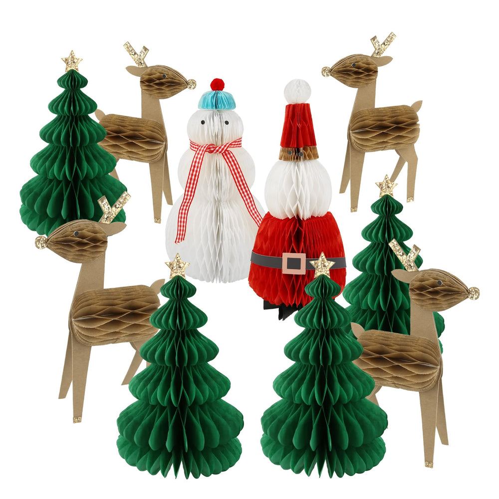 - The set includes 4 honeycomb Christmas trees, 4 reindeer, 1 Santa and 1 snowman