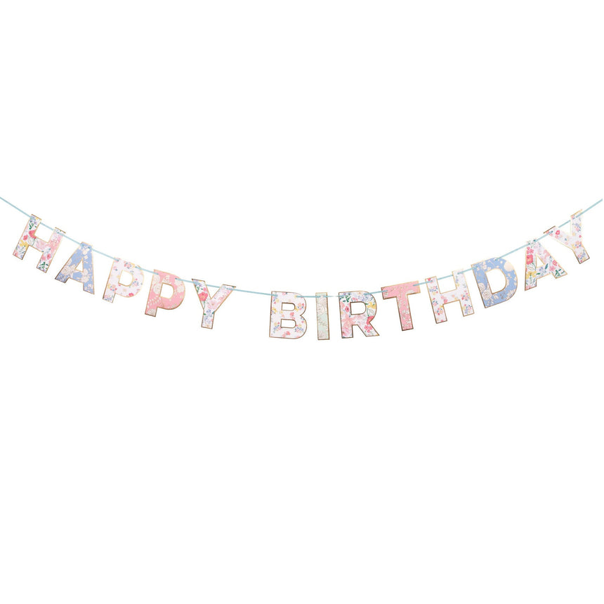 Our English Garden Birthday garland is a really beautiful way to spread the birthday message. Featuring the words "Happy Birthday" spelled out in fabulous floral letter pennants, pre-strung on mint ribbon. A really lovely decoration for a birthday party.
