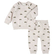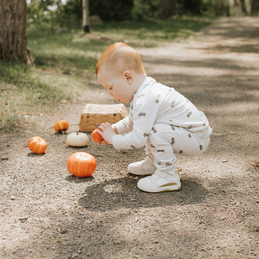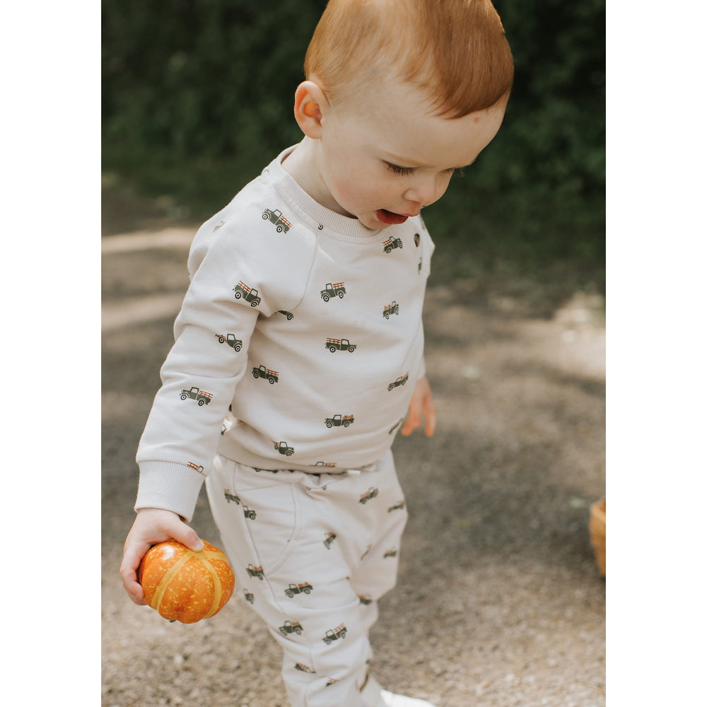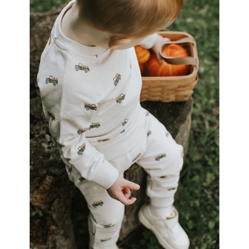 A cozy everyday set printed with our Pumpkin Patch Truck print for a festive ‘fit. The 2-piece set includes a fleece crewneck and matching comfy pants, perfect for puddle hunting or heading to the woods. Two buttons along the neckline make the top easier to pull over wriggly little ones while the joggers can pull up and down with ease.