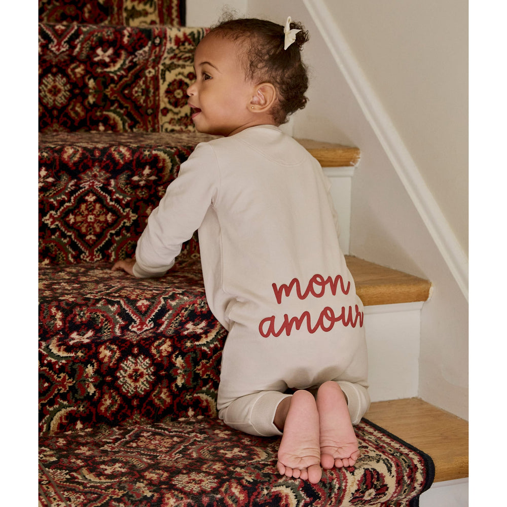 This adorable playsuit is perfect for the littlest member of the family and coordinates with sweaters from the same range for mom and older siblings. Made from the coziest French Terry, the one-piece will keep them snug and warm while the ribbed cuffs and ankles leave their hands and feet free to explore their surroundings. The full-length zip down the front makes dressing quick, easy and comfy. Finished with a chenille heart on the front and ‘Mon amour’ on the back, this piece is perfect for passing down through lovely little generations.