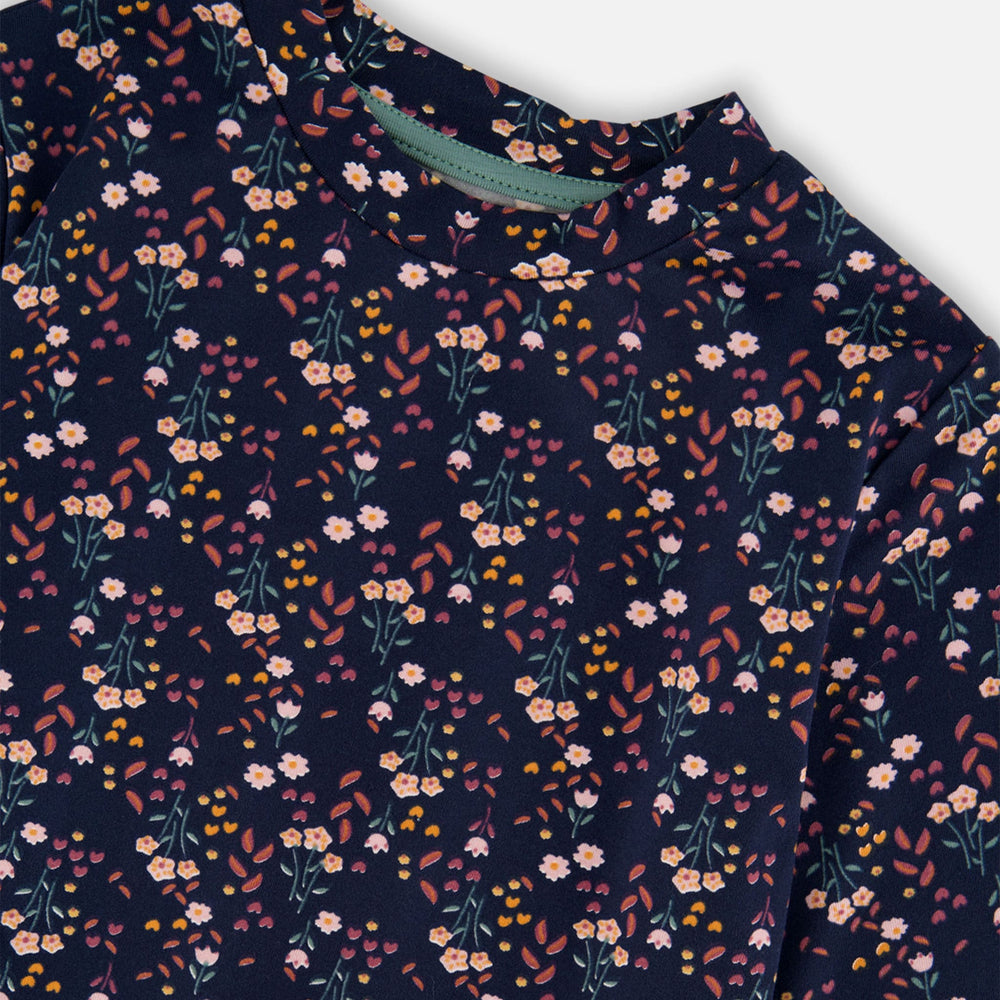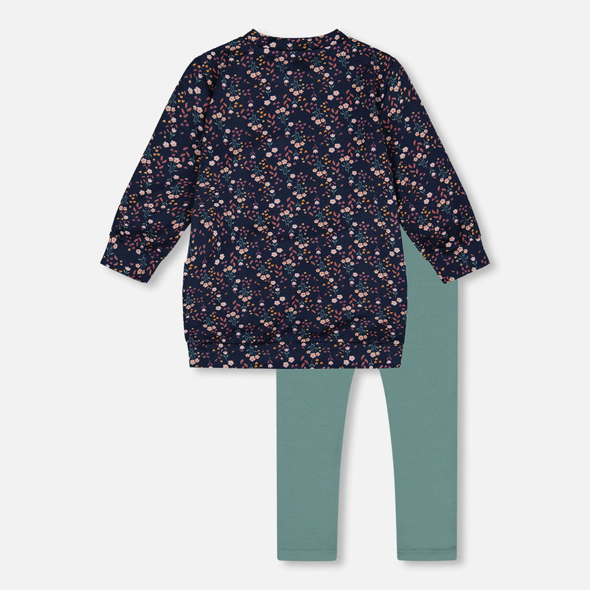 This adorable Tunic and Leggings Set in Navy Floral brings a fresh and fun look to your little one’s wardrobe. The soft, long-sleeve tunic features an all-over floral pattern, a relaxed fit and two slanted pockets, combining style and practicality. The coordinated solid color elastic waist leggings, adorned with a cute cat face detail on each leg, complete the set perfectly. Crafted from a soft blend of polyester and elastane, this set is perfect for playdates, naps, or a day of adventure, keeping your little one comfy and stylish all day long!