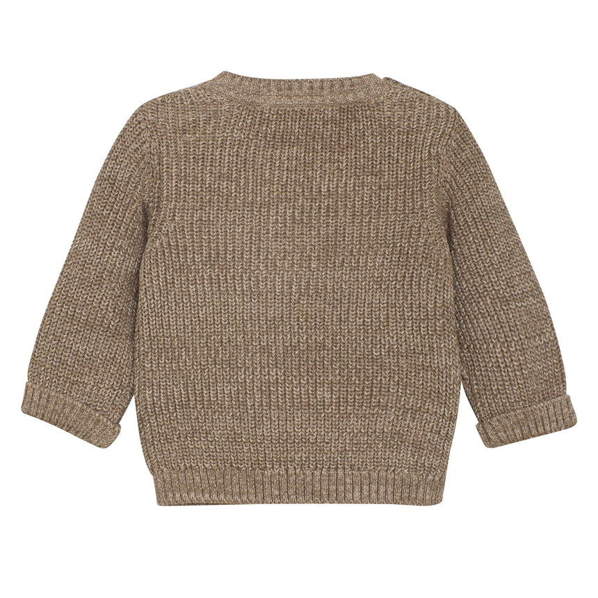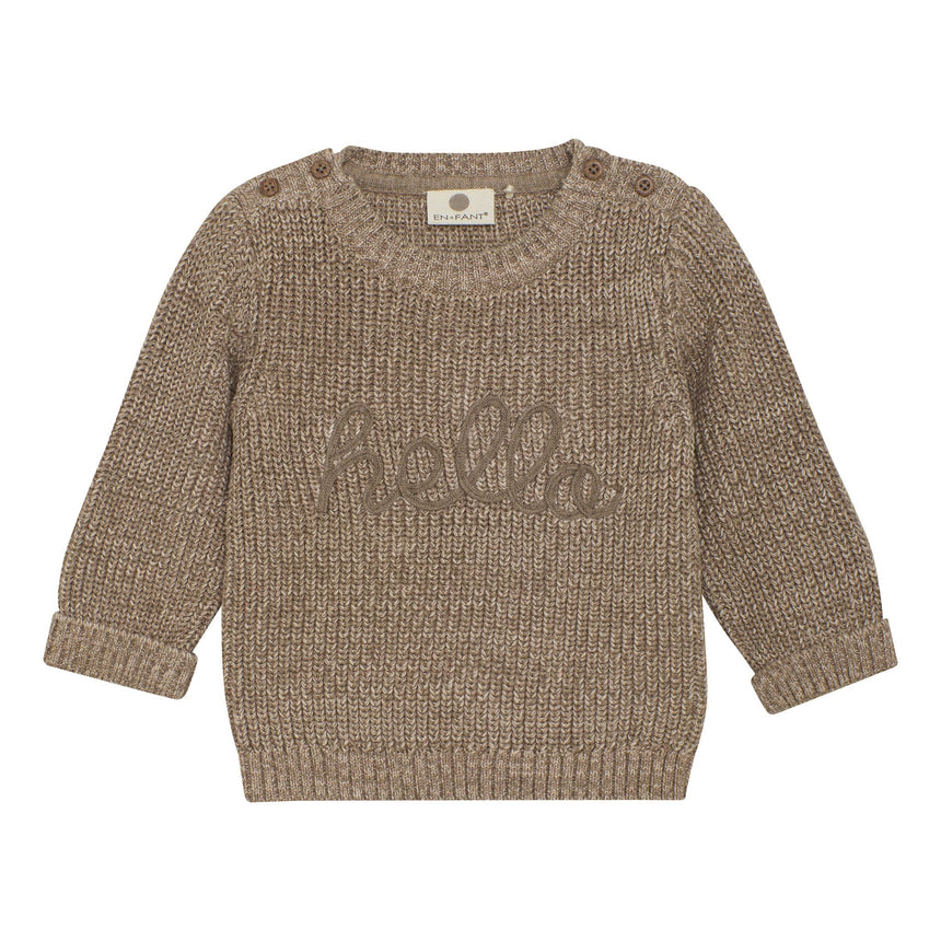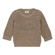 Lovely knitted sweater from EN FANT in a thick and soft cotton quality. The sweater features long sleeves, soft rib edges, buttons on both shoulders, and knitted text across the chest. Certified acc. to GOTS - organic CERES-0366