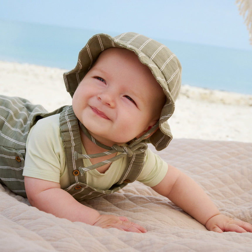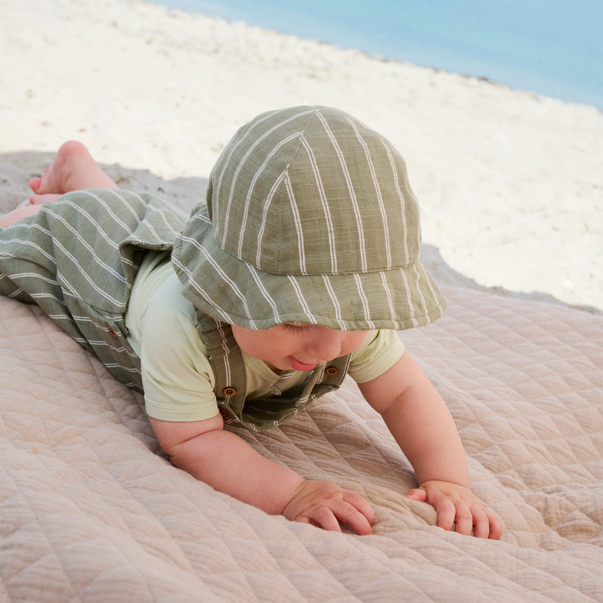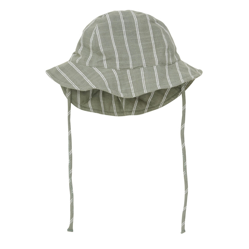 Nice striped summer hat from Minymo. The hat is made of 100% cotton and has nice stripes all over. A little elastic inside, which ensures a comfortable and individual fit. The straps can be tied together so that the hat does not fall off.