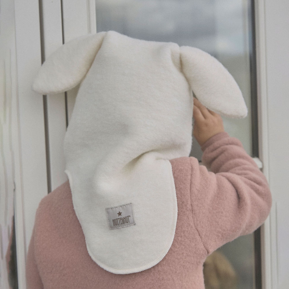 Lovely, warm, two-layer HUTTEliHUT balaclava with cute little bunny ears. The HUTTEliHUT balaclava has a wide, elasticated ribbed edge around the face, ensuring a secure fit. It features a practical split cut with extra length at the neck. The balaclava is made from a comfortable wool blend with a soft velvet lining. This product is made from wool, known for its durability when properly cared for: wash only when necessary. Use a gentle wool detergent. Do not use fabric softener. Always use the delicate wool cycle in the washing machine, turning the garment inside out. Use a gentle spin cycle. Reshape the garment while it is still damp. To hand wash, use lukewarm water and avoid wringing; gently squeeze with a towel to remove excess water. Dry flat on a towel.