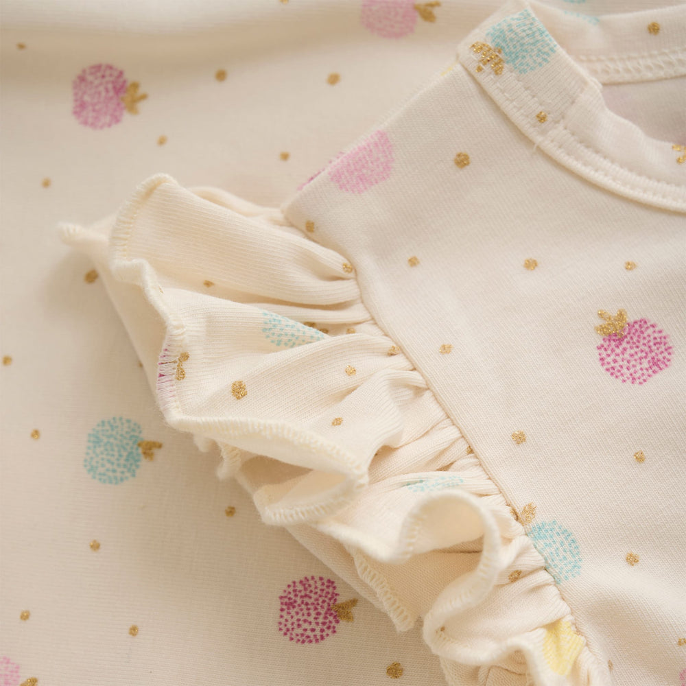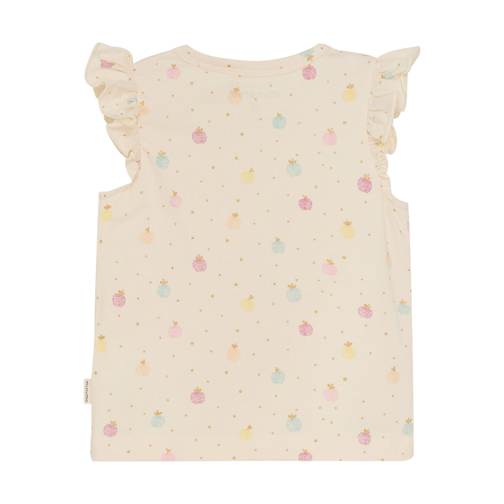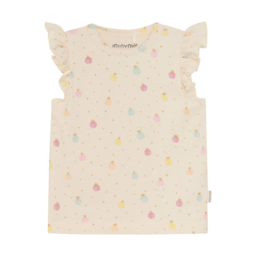 Nice short-sleeved t-shirt with allover print from Minymo. The T-shirt is made in a comfortable cotton blend and has a nice apple print all over. Large ruffles on the shoulders give a nice look. Closes with hidden snaps on the shoulder.