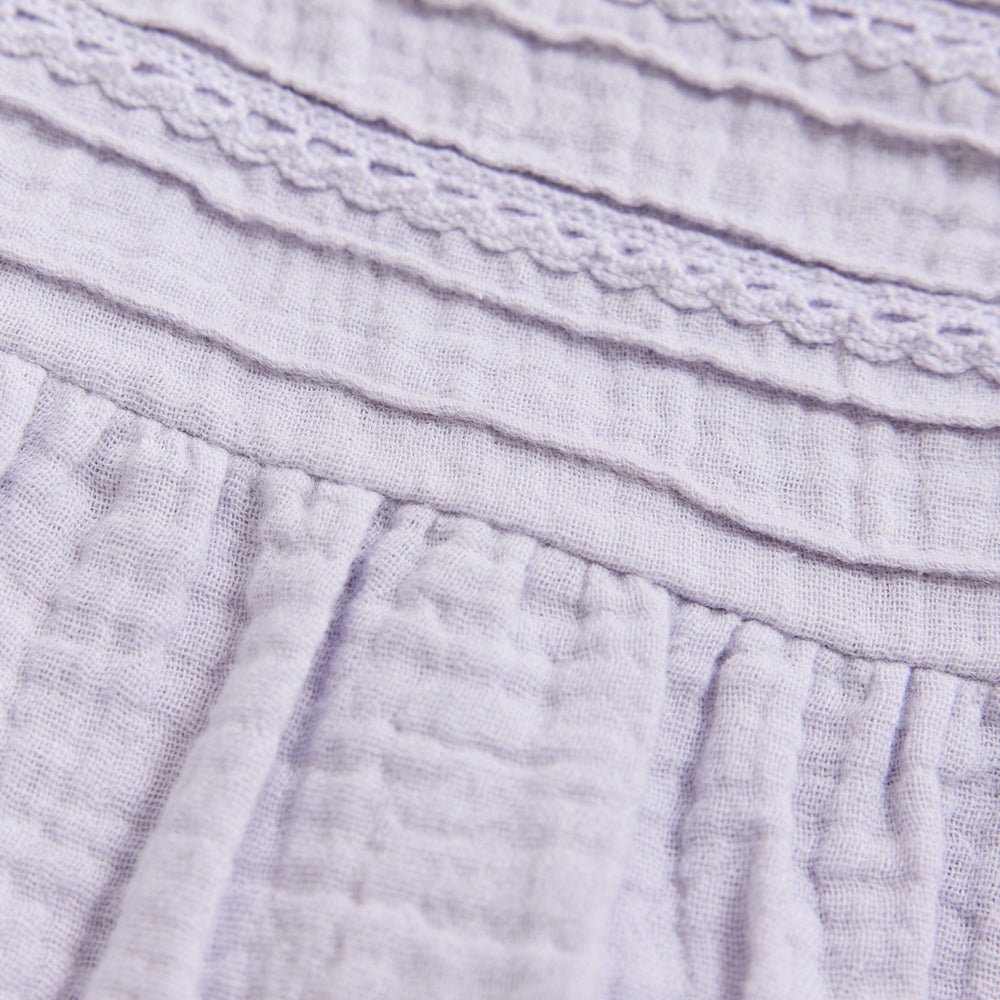 Dress from EN FANT. This dress is made in a muslin quality with flounce at the shoulders and a skirt with gathers around the waist. The dress has details with lace tape at the chest and can be opened at the neck. Certified acc. to GOTS - organic CERES-0366