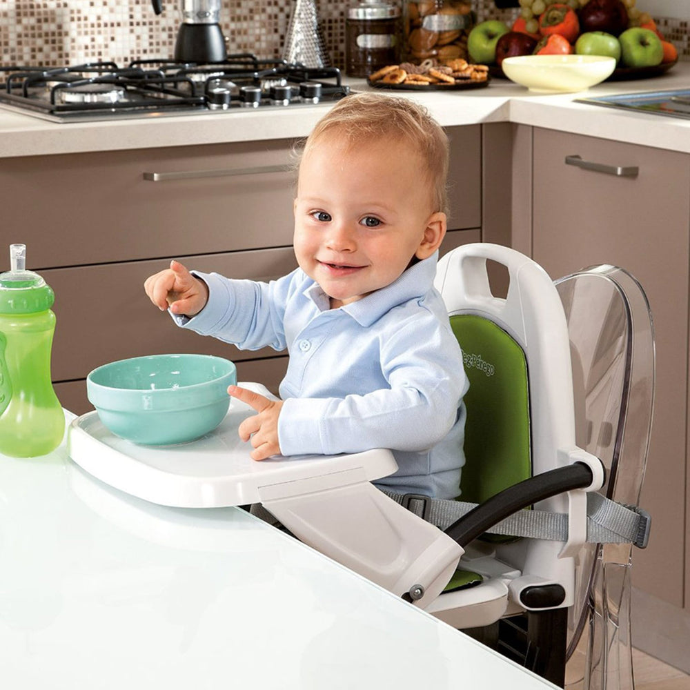 -Three-Point safety harness attaches to child and dual attachment straps connect behind and below seat (Non-skid rubber pads where the booster touches the dining chair also aid in keeping the Rialto in place)