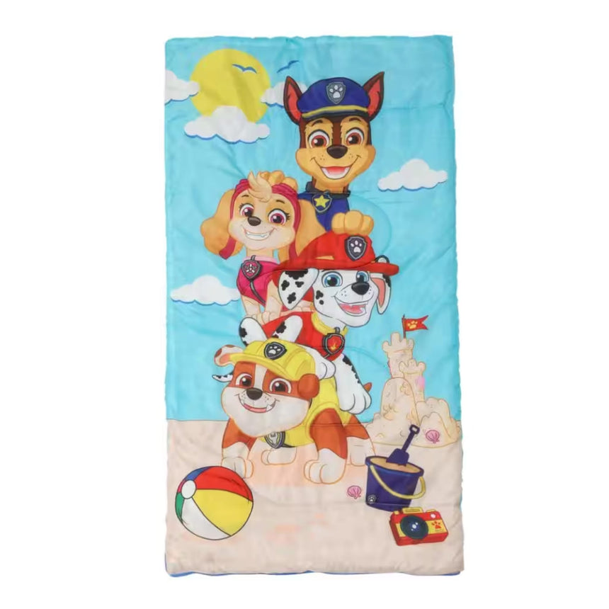 The Paw Patrol Sleeping Bag is the perfect way for young fans to drift off to sleep with their favorite pups by their side! Featuring bright, colorful graphics of Chase, Marshall, Skye, and the rest of the Paw Patrol team, this cozy sleeping bag offers warmth and comfort for sleepovers, camping trips, or nap time. Soft and durable, it's designed for easy roll-up storage and travel, making it ideal for on-the-go fun. Whether at home or on an adventure, your little one will love snuggling up with their Paw Patrol heroes. Sized just right for little ones, this Paw Patrol sleeping bag with carry case duffle will be the center of attention at the next sleepover. Your child can take their Paw Patrol adventure anywhere they go. The side zipper of this sleeping bag makes getting in and out easy. Great for sleepovers, watching TV, naptime and much more. Sleeping bag features your favorite Mighty Pups: Skye, Rubble, Zuma, Rocky, Everest, Chase and Marshall. Set includes (1) sleeping bag and (1) carry case duffle bag. Slumber bag measures: 56" x 28" and carry case measures 8.5" x 13.5". Makes a great gift. Recommended for indoor use.