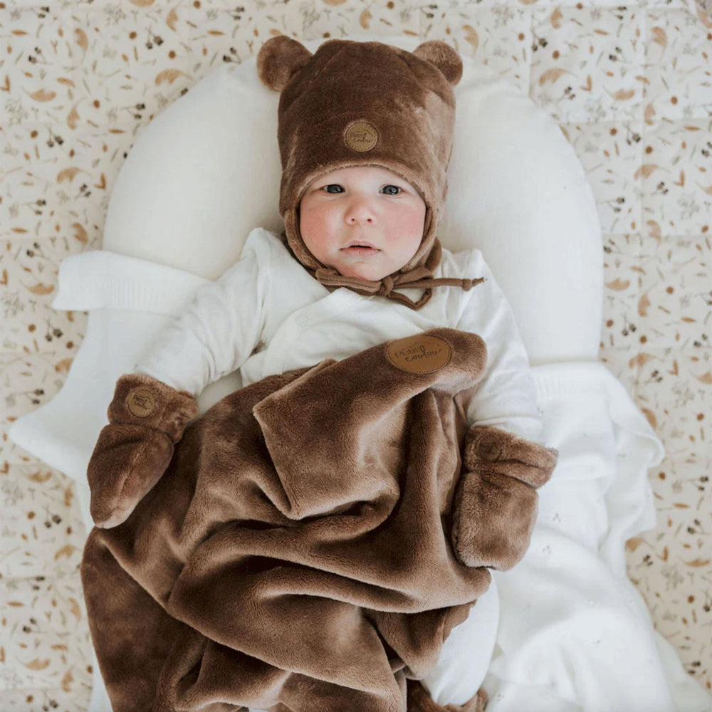 This beautiful set keeps baby cozy over 3 seasons (spring, fall and winter), making it an indispensable ally for moms. Made from woven polyester and minky (plush texture), it includes a cute pair of booties, a teddy bear beanie adorned with cute little ears, a pair of mittens and a soft fluffy blanket to keep baby cozy and warm during outdoor outings.