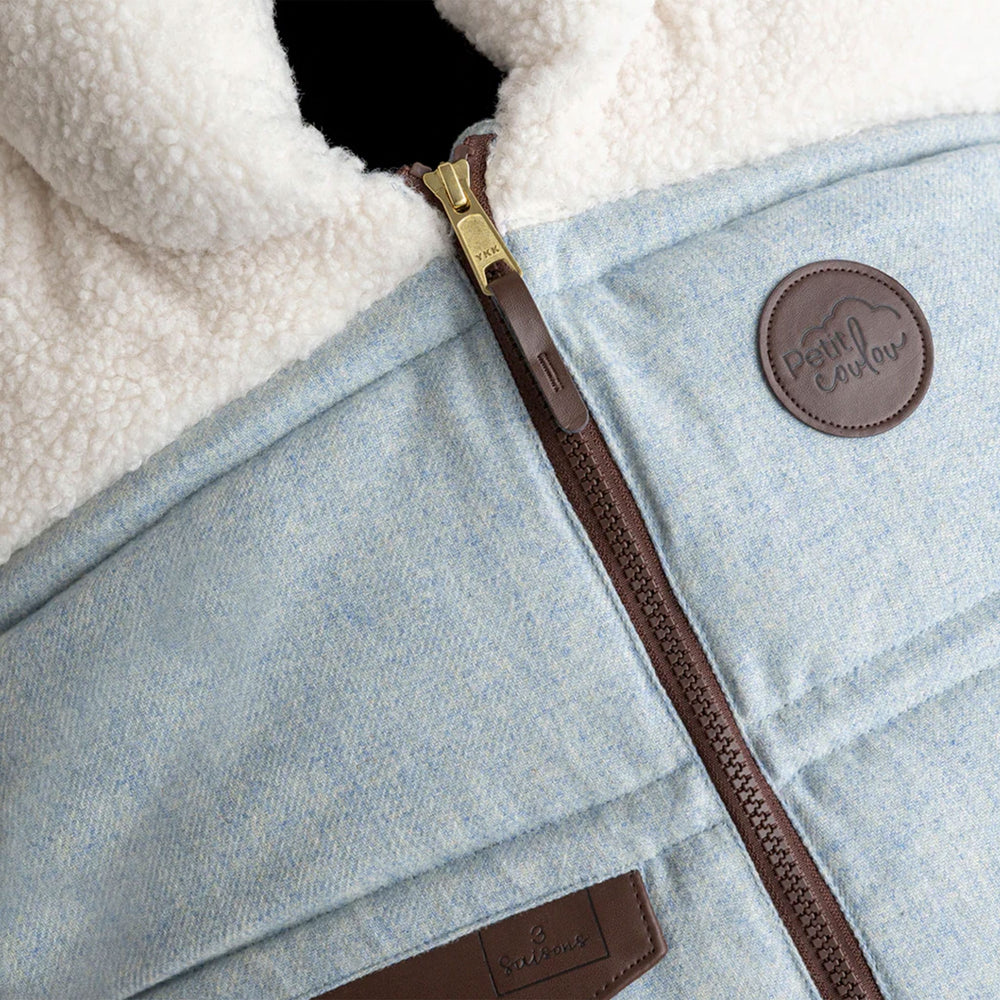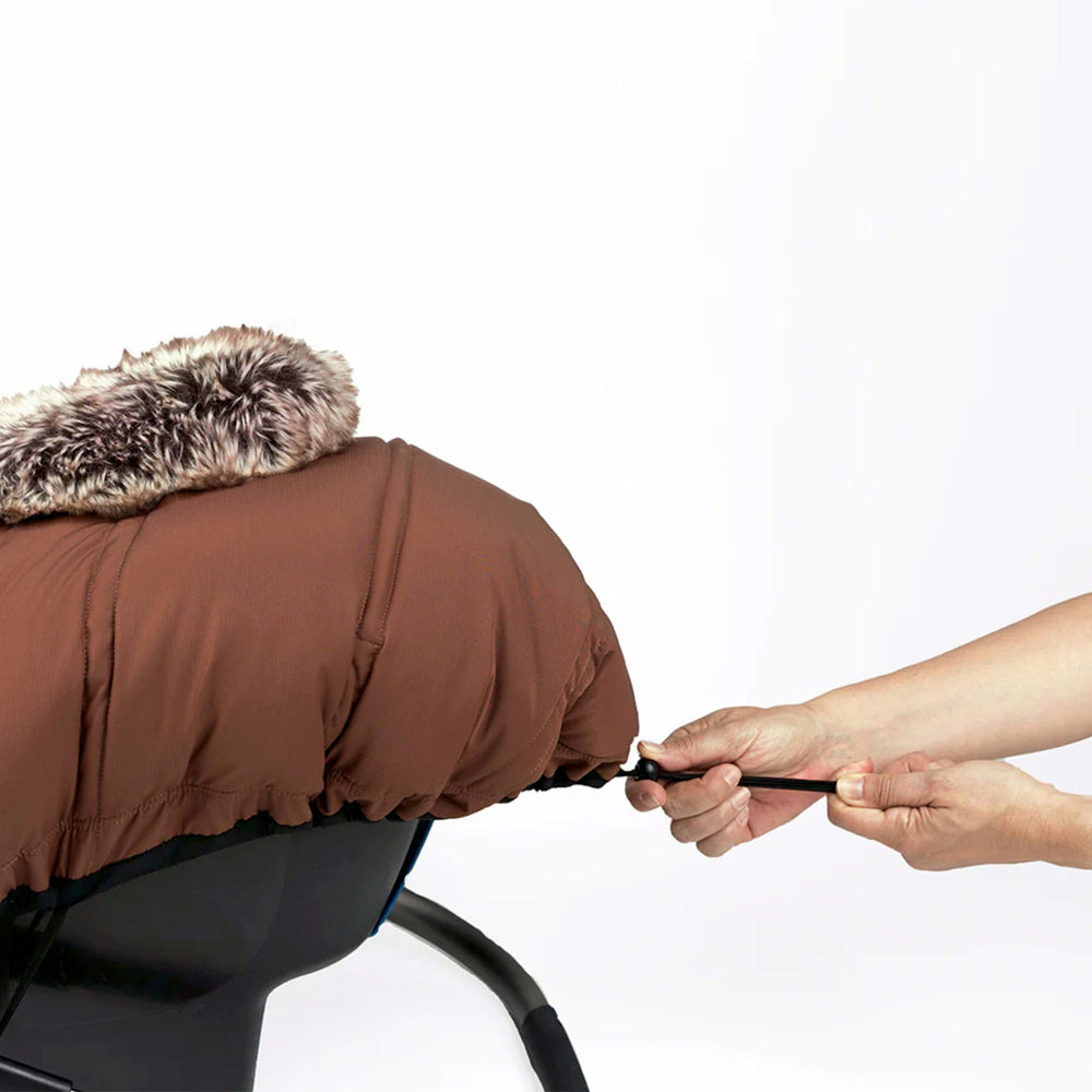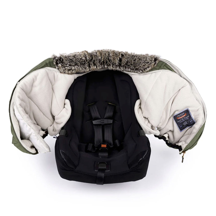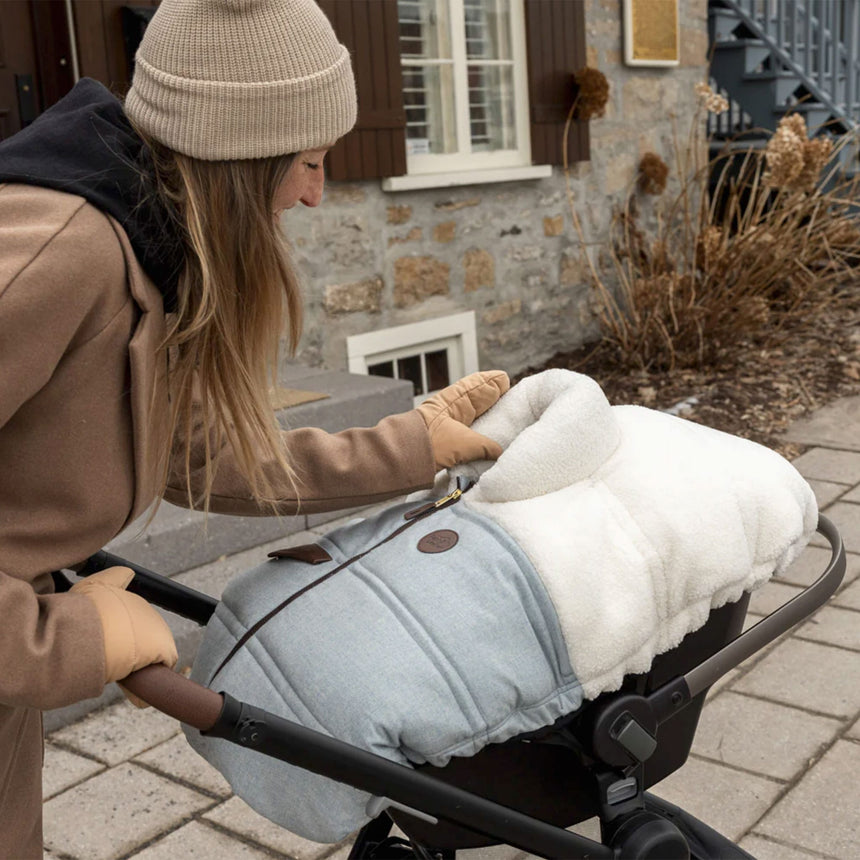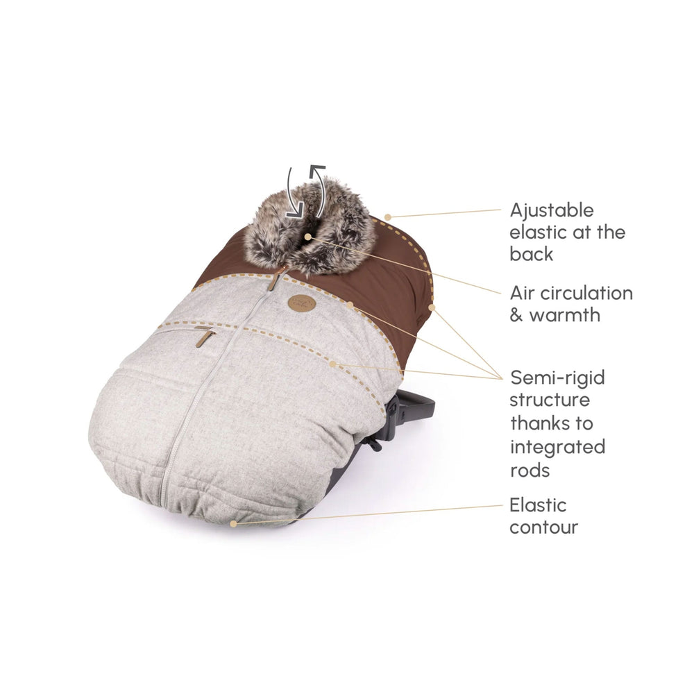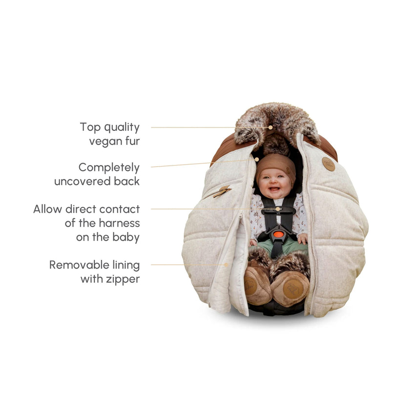 The 3 seasons car seat cover is inspired by the outdoor excursions of Western Canada, with its sherpa material evoking the region's natural landscapes. Like a coat with a removable lining, it's designed to combine winter and mid-season (fall and spring). Our 3 seasons car seat cover won't shift or slip in windy conditions. Thanks to its lightweight, water-repellent material and igloo effect, your baby will be protected from the elements and unwanted touches. The only cover on the market to offer structural support to prevent sagging. Safety and comfort are our pledge of quality to give parents peace of mind.