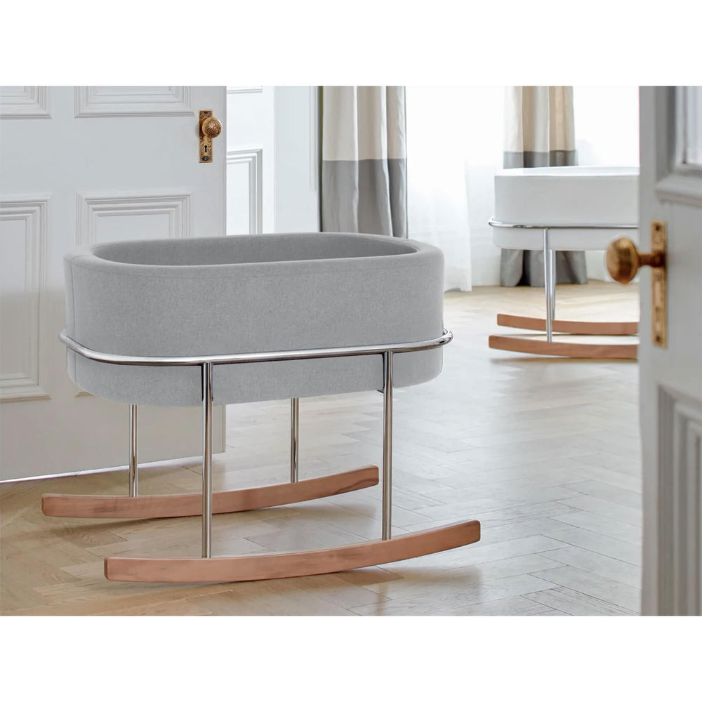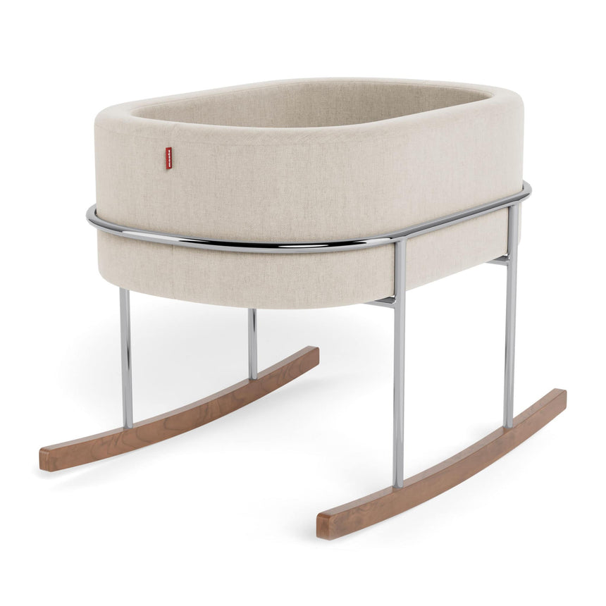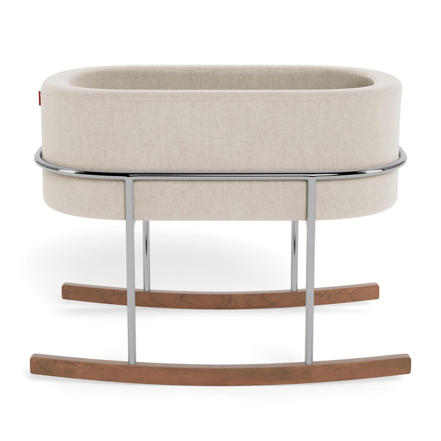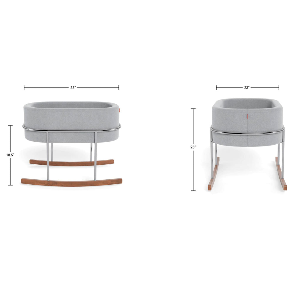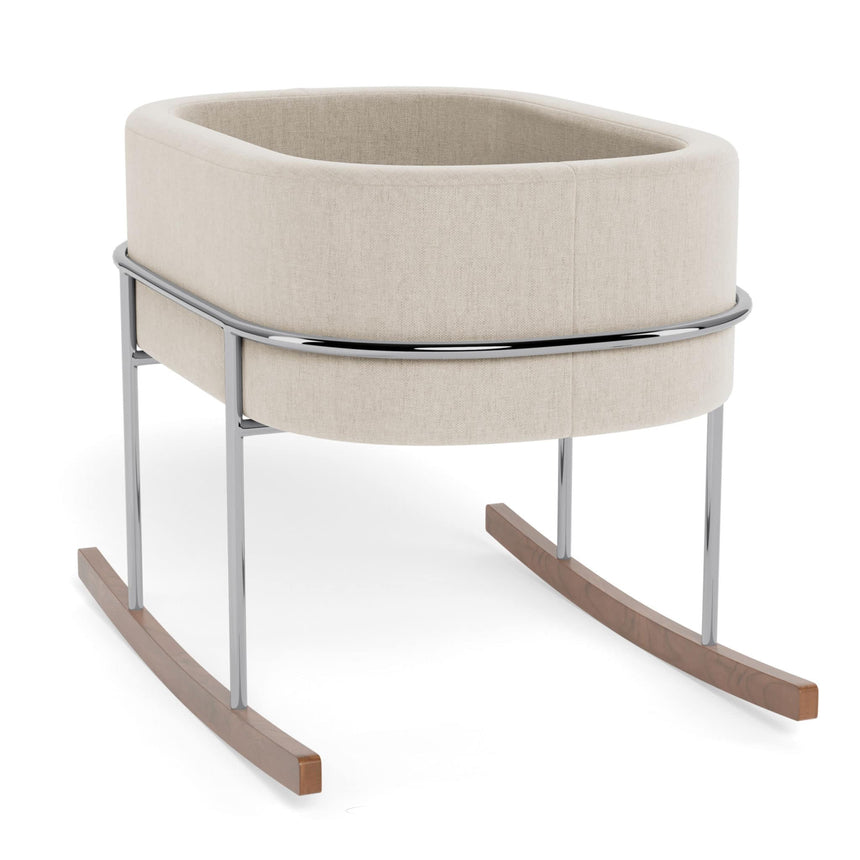 Our Rockwell bassinet is synonymous with ultimate modern luxury; it is the perfect combination of beautiful materials and a soothing rock for your little one. Its streamlined chrome stand with solid walnut rocking feet is beautifully contrasted to the soft upholstered basket that can be removed and transported to different rooms in your home (or the Grandparents' home!). When you are finished with the bassinet, the basket alone makes an excellent spot to store all your baby's new stuffies!