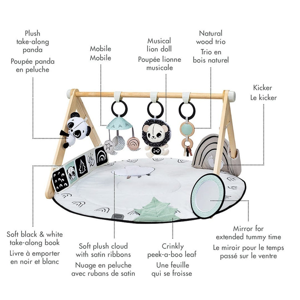 Babies will be delighted by the charming responsive musical lion doll, geometric contrasting mobile, giant rainbow kickers, soft black and white take along book, tummy time mirror, and crinkly toys as they meet essential milestones through play and exploration. Uniquely designed with a stand-alone, natural wooden arch, the Gymini will entertain your baby from the newborn months through the sitting stage while adding a trendy decor accent to your home.