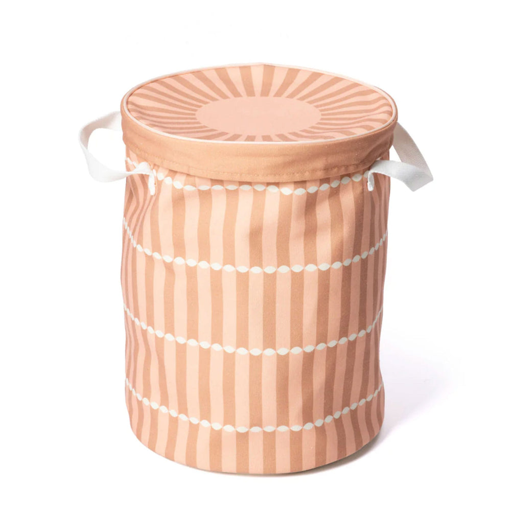 Designed as a single integrated piece, the playmat is securely stitched to the opening of the basket and the lid is attached — no loose parts, no fuss.