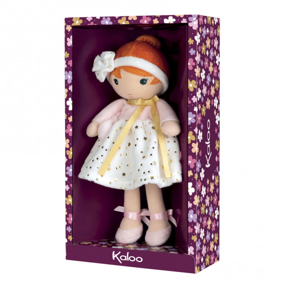 Explore the classical dancer who is the stuff of little ballet fans' dreams! Dressed in a powder pink wrap-over top embellished with a golden scarf and an oh-so-soft champagne-coloured star print skirt, Valentine reveals delicate, refined style. Her red hair distinguishes her from other Tendresse dolls. Machine washable.