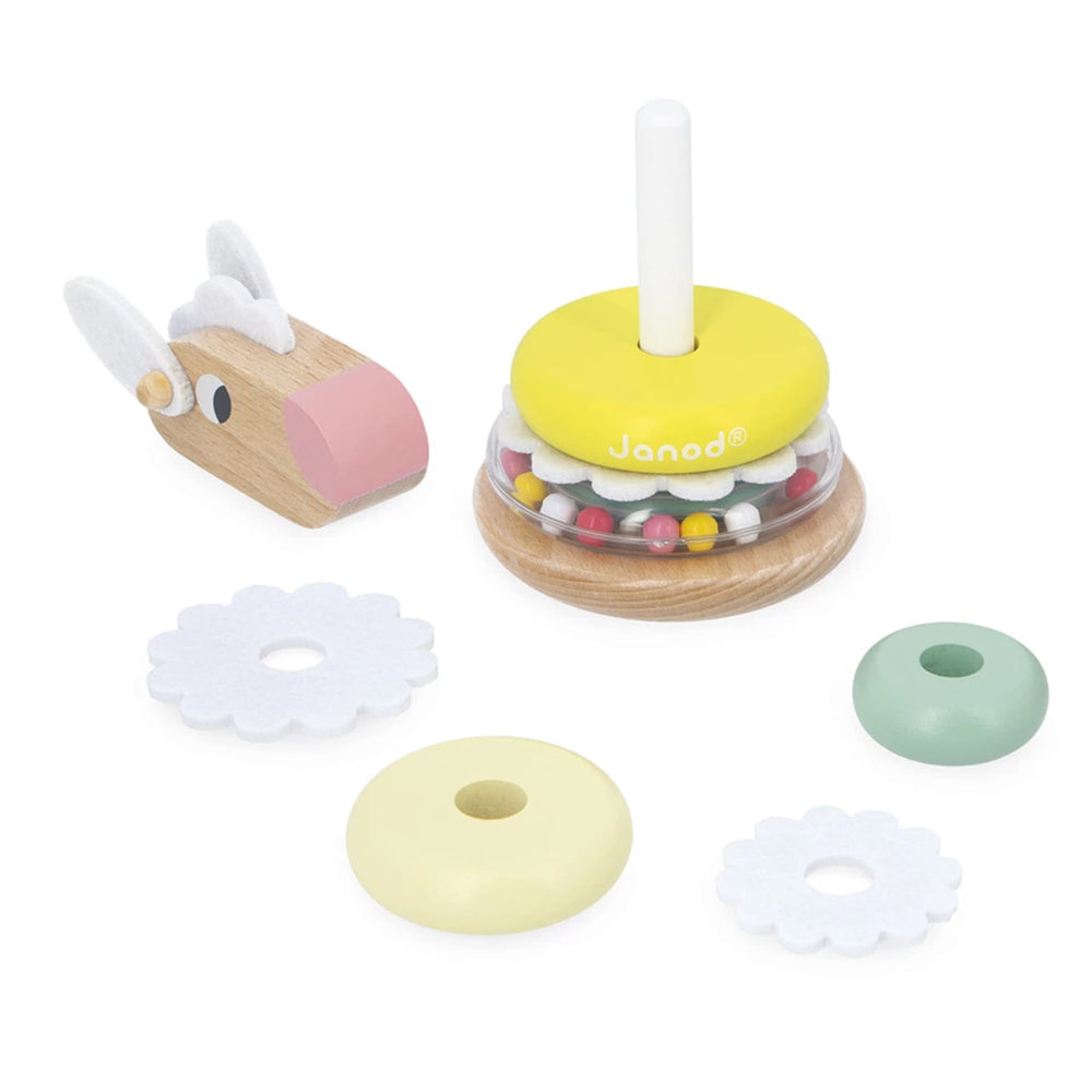 One piece, two pieces… the sheep takes shape again! With this stacking sheep, children as young as 1 year old discover the joys of building, while developing their motor skills and hand-eye coordination. The child gradually assembles each piece: the transparent ring filled with colorful beads, the wooden rings, the felt elements to insert, and finally the sheep's head. Once the toy is fully stacked, they can shake it to make the beads move inside the ring, adding a sound and sensory dimension to the game. But that's not all! The sheep also transforms into a roly-poly toy thanks to its rounded base: it rocks gently without ever falling over. An activity that extends the fun! This stacking sheep is from the Zigolos range: a joyful and colorful collection with playful shapes, designed to awaken the senses and accompany toddlers in their first discoveries. This developmental toy is made with FSC™ certified wood and water-based paint.