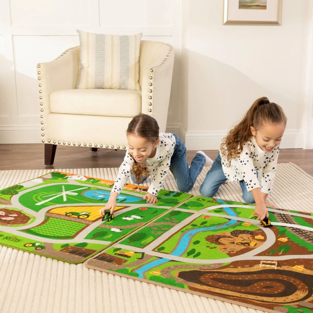 - Explore the countryside, pastures, and fields with the farm mat that includes a John Deere tractor.