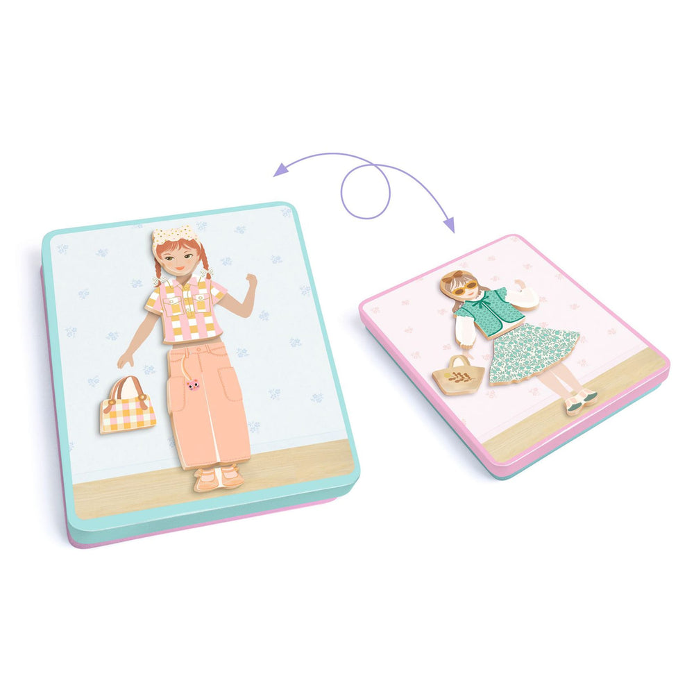 Children play with wooden magnets on a thin metal box. They recreate the 12 outfits shown on the cards, choosing the right side of the box.
