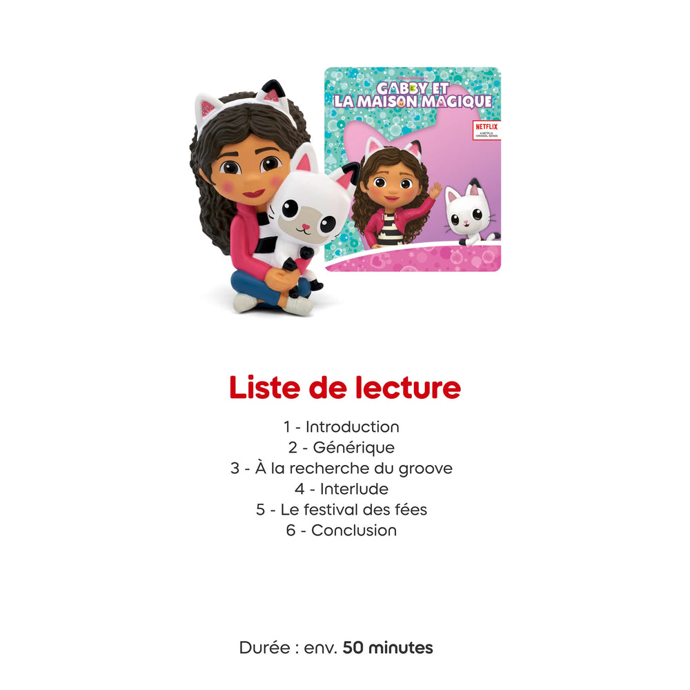 Join Gabby and her friends in the magical dollhouse adventure! This Tonie teaches: imagination, exploration, and problem-solving. Please note: the content of this Tonie is in French.