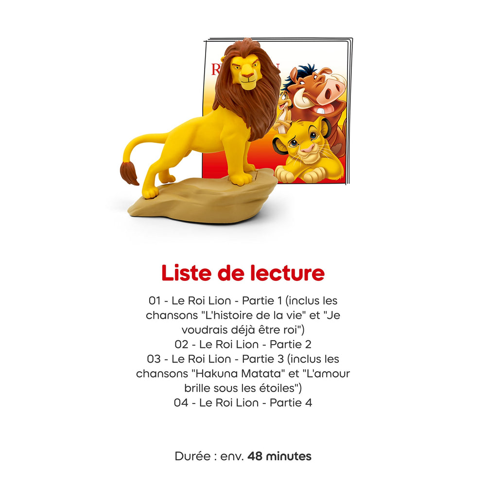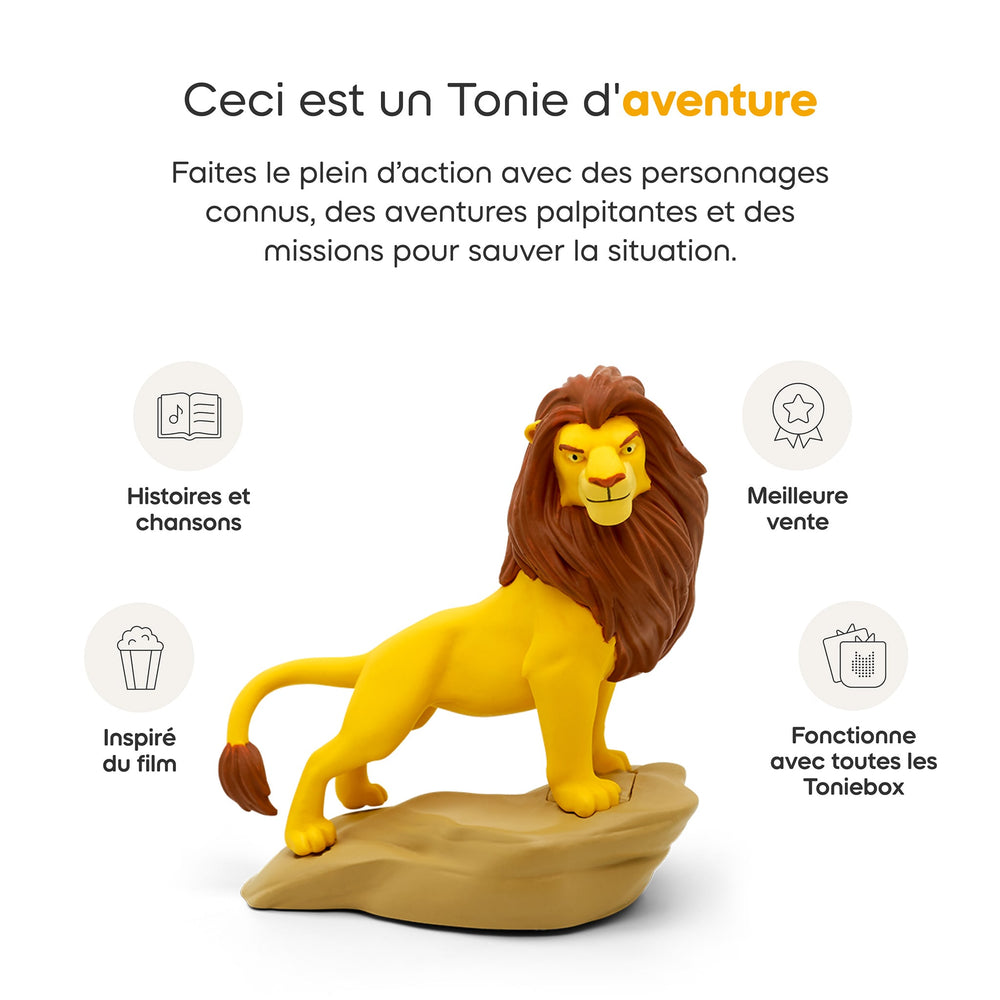 Discover the journey of young lion-cub Simba as he faces exile, finds new friends in the jungle, and returns to reclaim his place in the Circle of Life. This Tonie teaches: courage, friendship, perseverance, and responsibility. Please note: the content of this Tonie is in French.