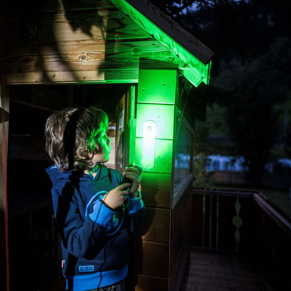 The Kidbeam4 is a robust flashlight specially designed for children. It shines in four different colors (white, red, green, and blue) and includes a flashing mode. Perfect for exploring and playing, it combines safety, practicality, and fun.