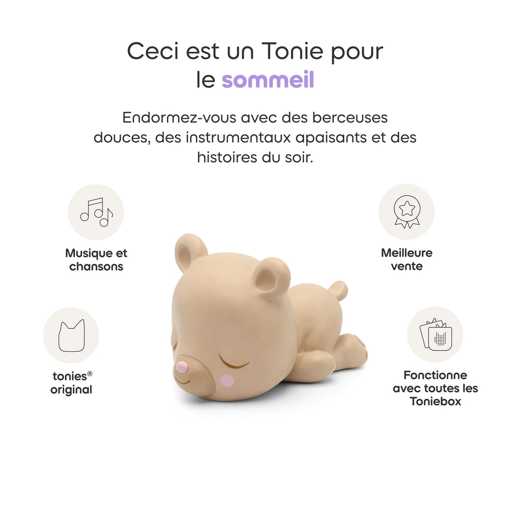 Create calming bedtime rituals with the Sleepy Friends collection. This Tonie features a wonderful bedtime story about Sleepy Bear’s journey home from Grandma and Grandpa’s house. On his way, he visits the squirrel, badger, rabbit, raccoon and many other animal families who are getting ready for slumber time themselves. Listen along to a soothing voice, rhymes, and repetition with a cozy atmosphere. And while the sun goes down in the slumber forest, the narrator and music also become quieter and quieter, helping little listeners drift off to sleep. This Tonie teaches: being true to yourself, bedtime routines, and strengthening family bonds. Please note: the content of this Tonie is entirely in French.