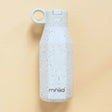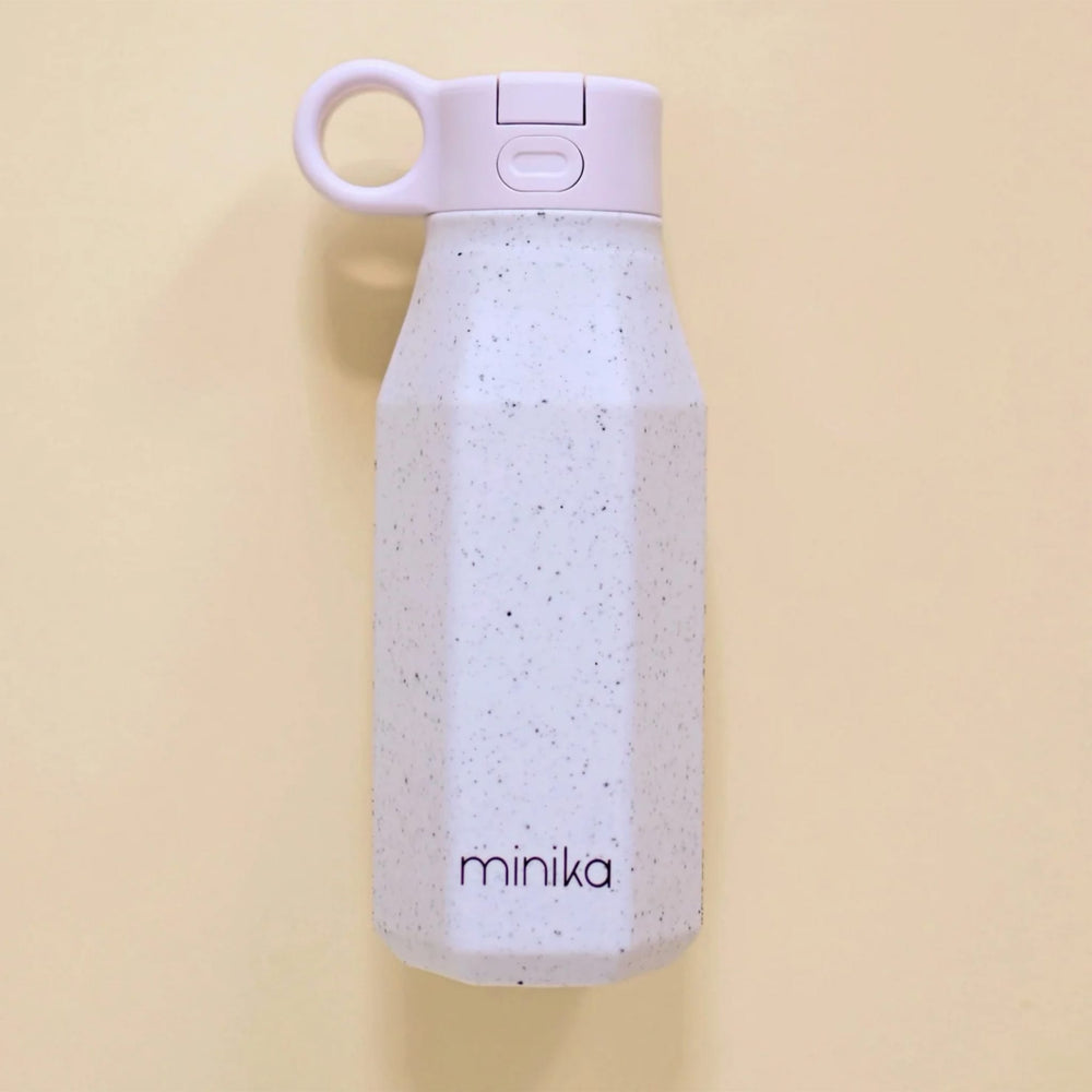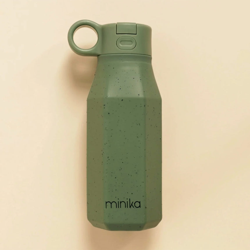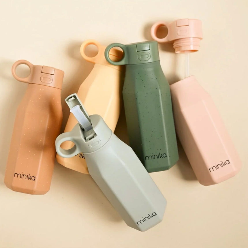 Silicone water bottle with straw and plastic lid. BPA-free food grade silicone. Wash with soap and a damp cloth or in the dishwasher. Ideal for transporting dinner in the lunch box.