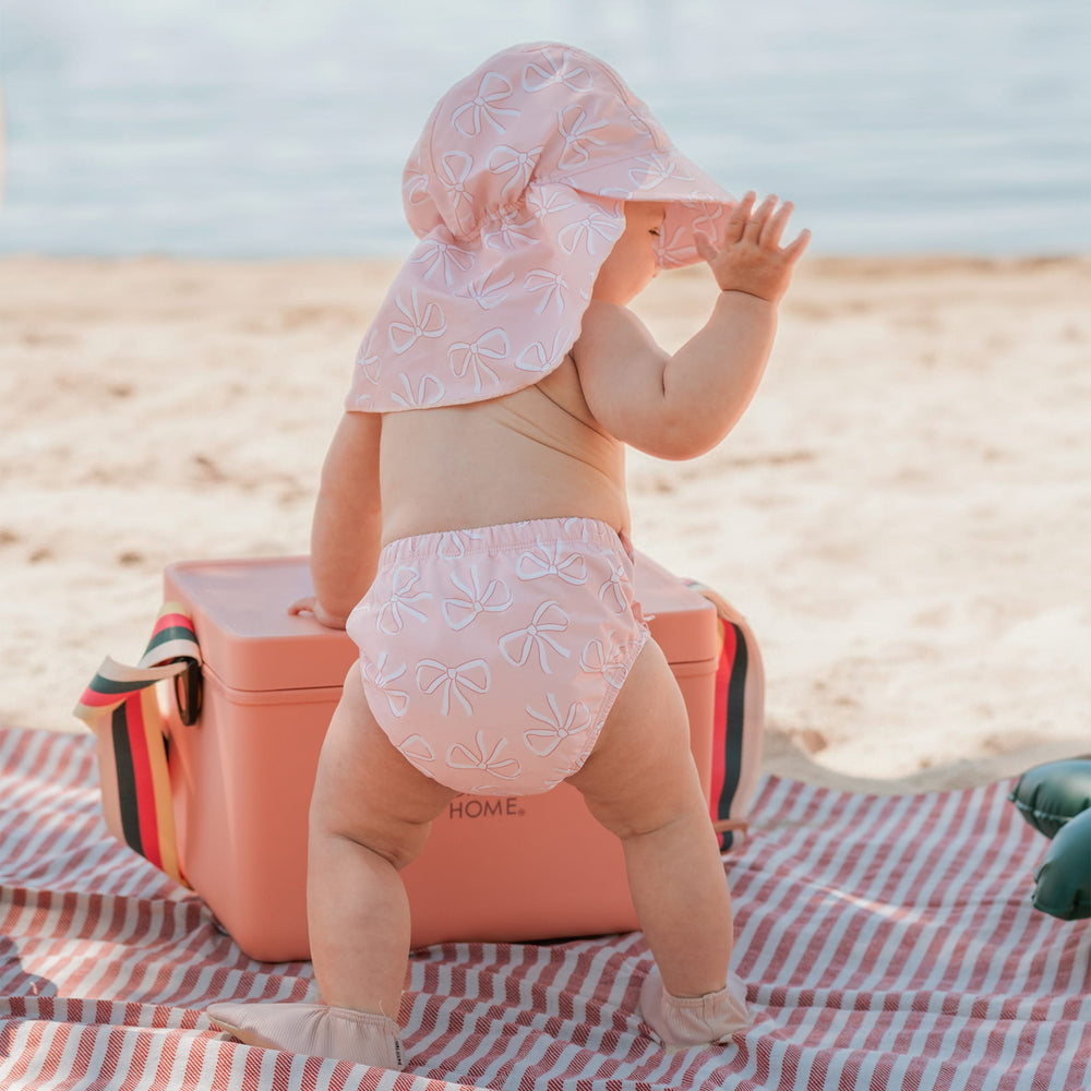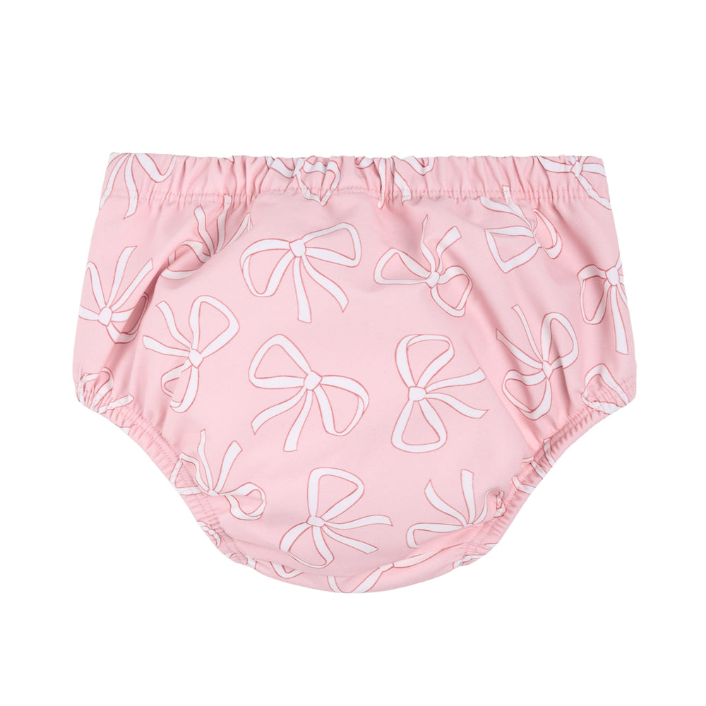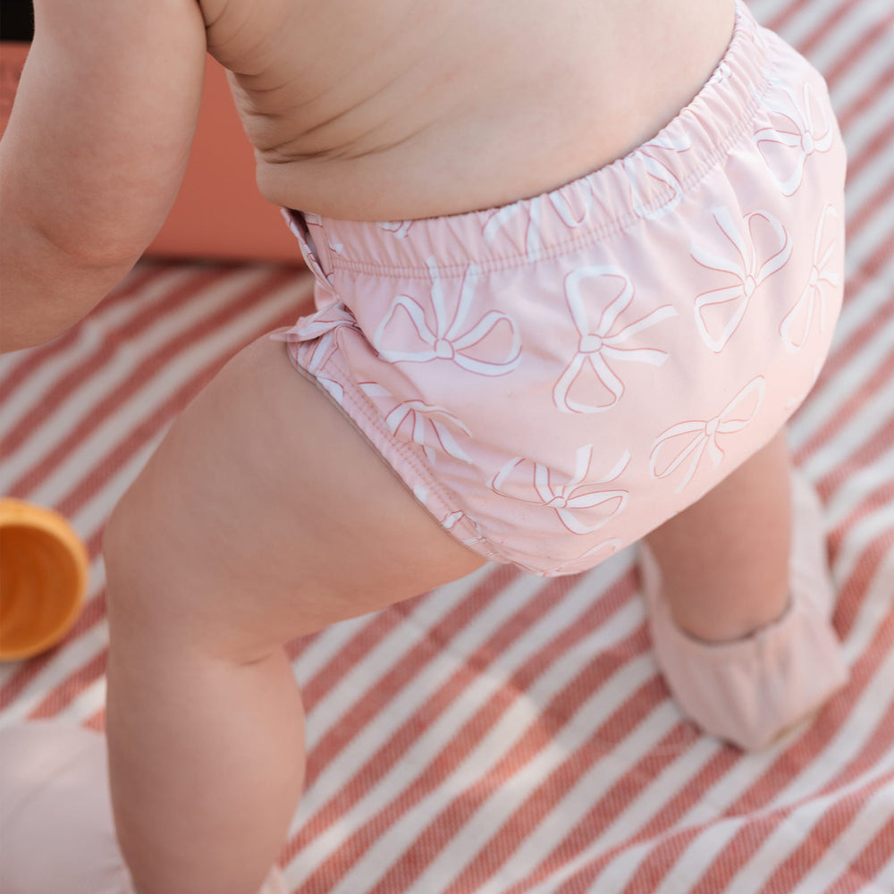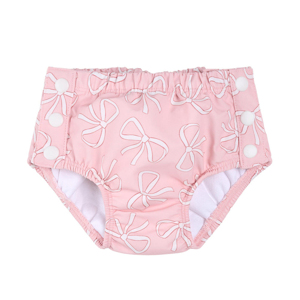 Let little ones enjoy summer’s simplest pleasures like splashing in the pool or running in and out of the sea with this adorable Bows printed swim diaper. The soft and lightweight microfiber diaper provides a snug and secure fit, allowing her to roam free in confidence. Elasticized leg openings ensure comfort and containment, and snap buttons along both sides make mess-free changing quick and simple.